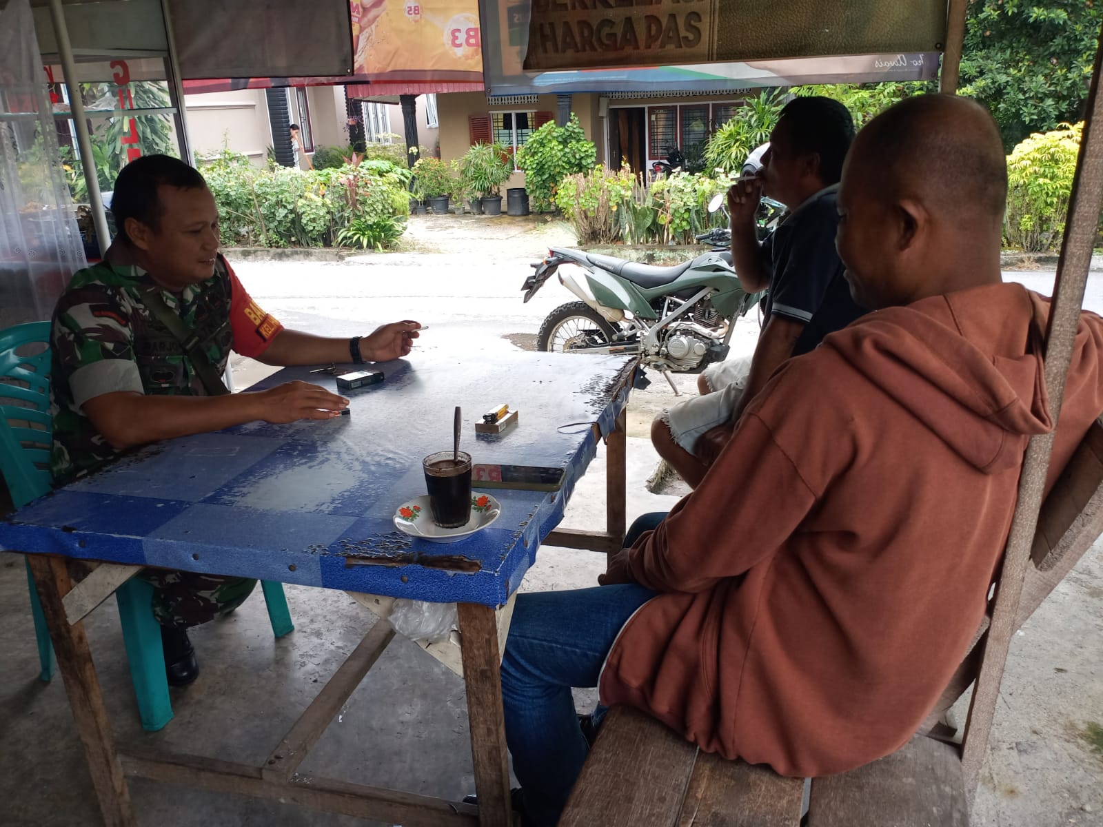 Babinsa Serka Kusman Darmanto Koramil 06/SKJ Kodim 0301/Pbr melaksanakan Komsos dengan masyarakat di kedai Agus Jalan Lili Kelurahan Kedungsari Kecamatan Sukajadi Kota Pekanbaru, Sabtu.