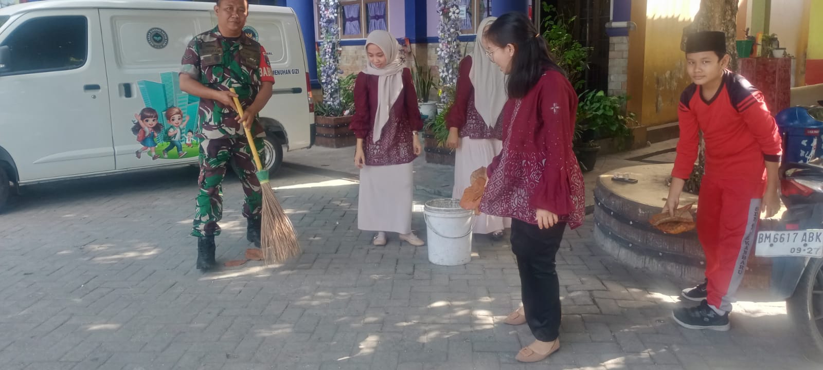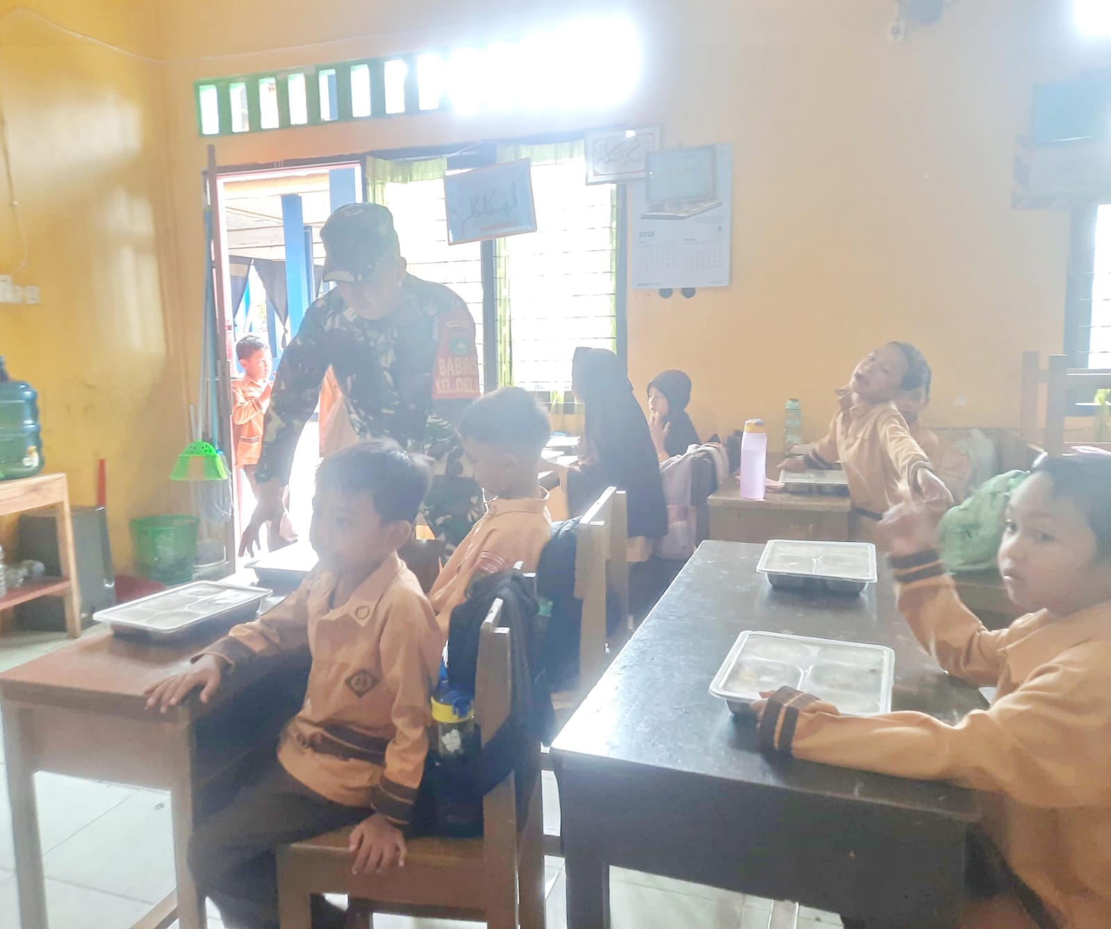 Babinsa Serka Toni Efendi Bagikan Makanan Sehat Bergizi untuk Siswa SDN di Kelurahan.