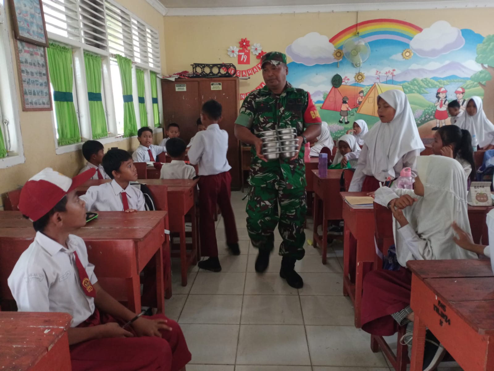 Babinsa Serda M. Fauzi Bagi Makanan Sehat Bergizi, Anak-anak SDN 167 Pekanbaru Riang.