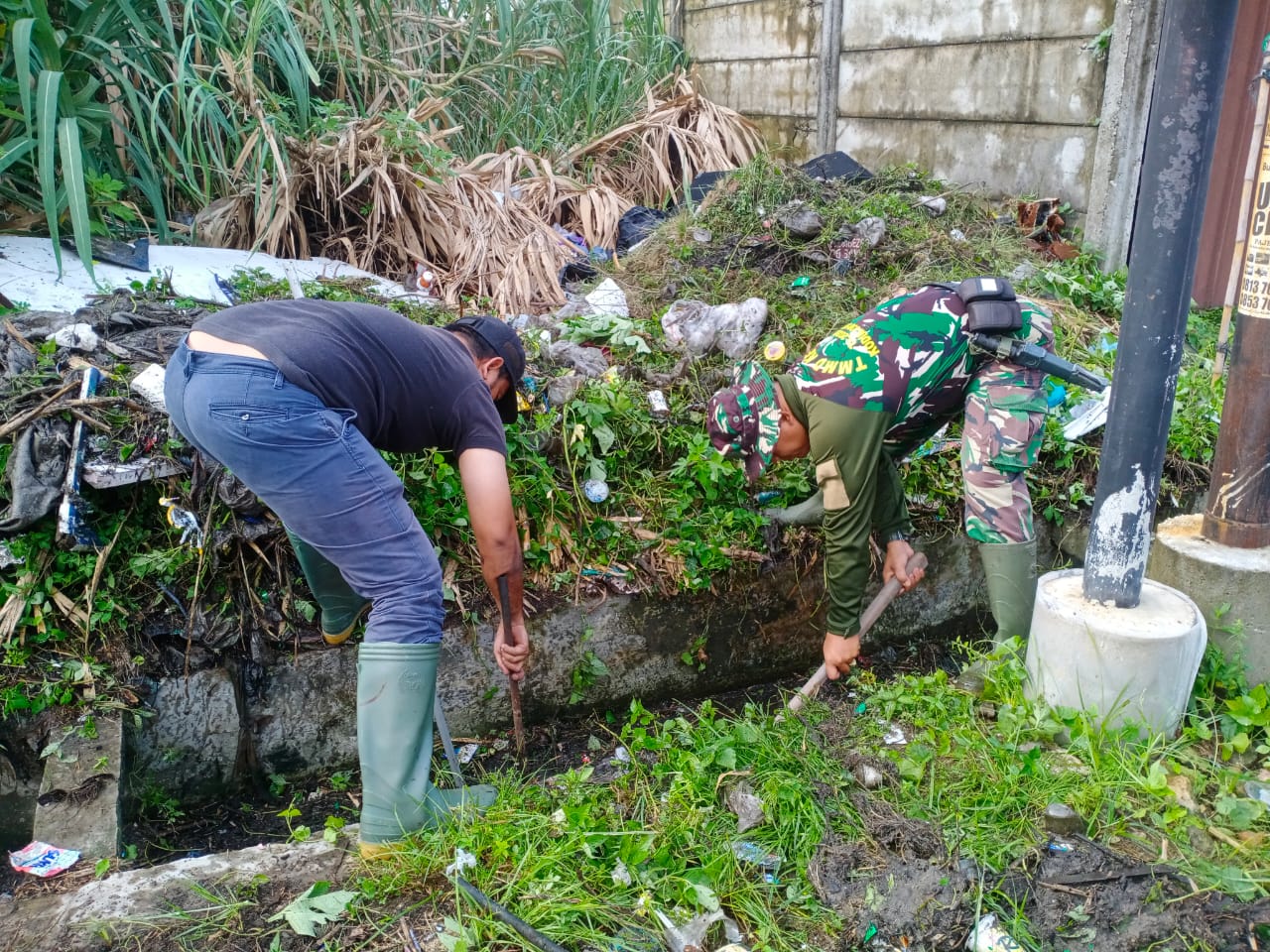 Babinsa Kelurahan Tobek Godang Koramil 06/Sukajadi Kodim 0301/Pekanbaru, Serma Misbahuddin melaksanakan gotong royong normalisasi parit di Jalan Abadi Arengka RW 03 Kecamatan Binawidya Kota Pekanbaru, Senin.