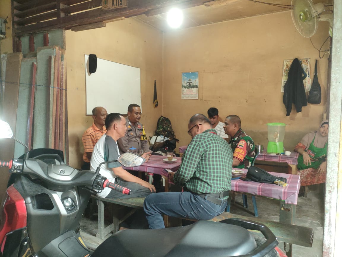Babinsa Koramil 06/Sukajadi Kodim 0301/Pekanbaru, Sertu Wiyono melaksanakan komunikasi sosial dengan Ketua RW 06 Anton dan warga ngobrol santai membahas keamanan dan ketertiban lingkungan.