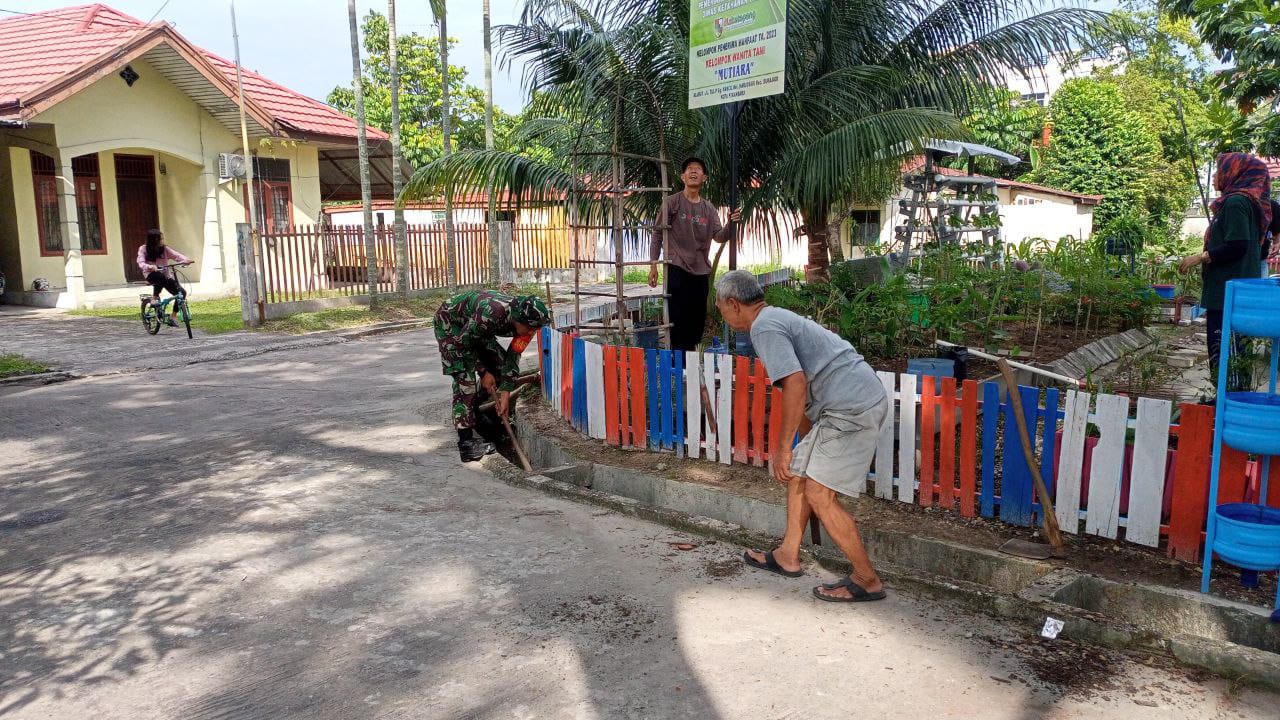 Serda Yasir Anhar Babinsa Harjosari wilayah Koramil 06/Sukajadi Kodim 0301/Pekanbaru melaksanakan kegiatan karya bakti di pekarangan kosong dan pembuatan apotik hidup bersama Dwi Sentono Ketua Forum RT/RW di Gang Muammalah Kecamatan Sukajadi, Rabu.