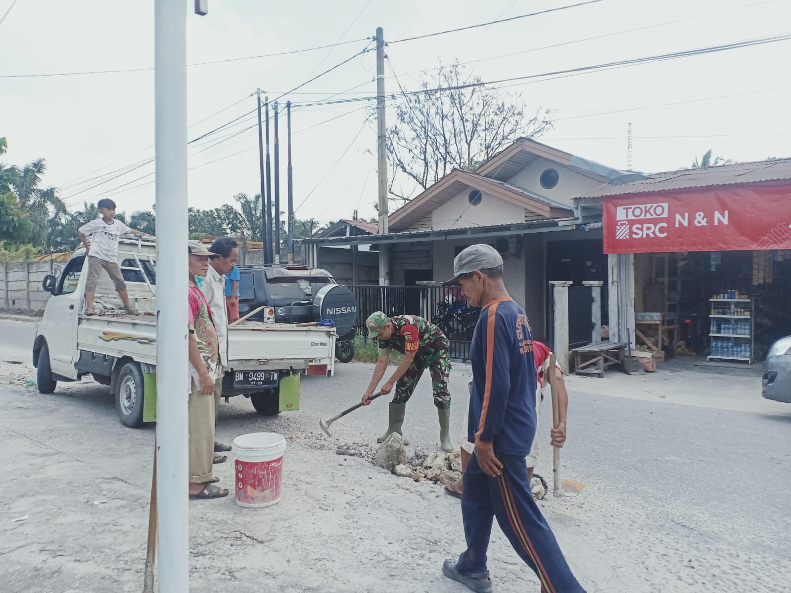Bersama Warga, Babinsa Harjosari Ikut Goro Timbun Jalan Berlobang di Bunga.