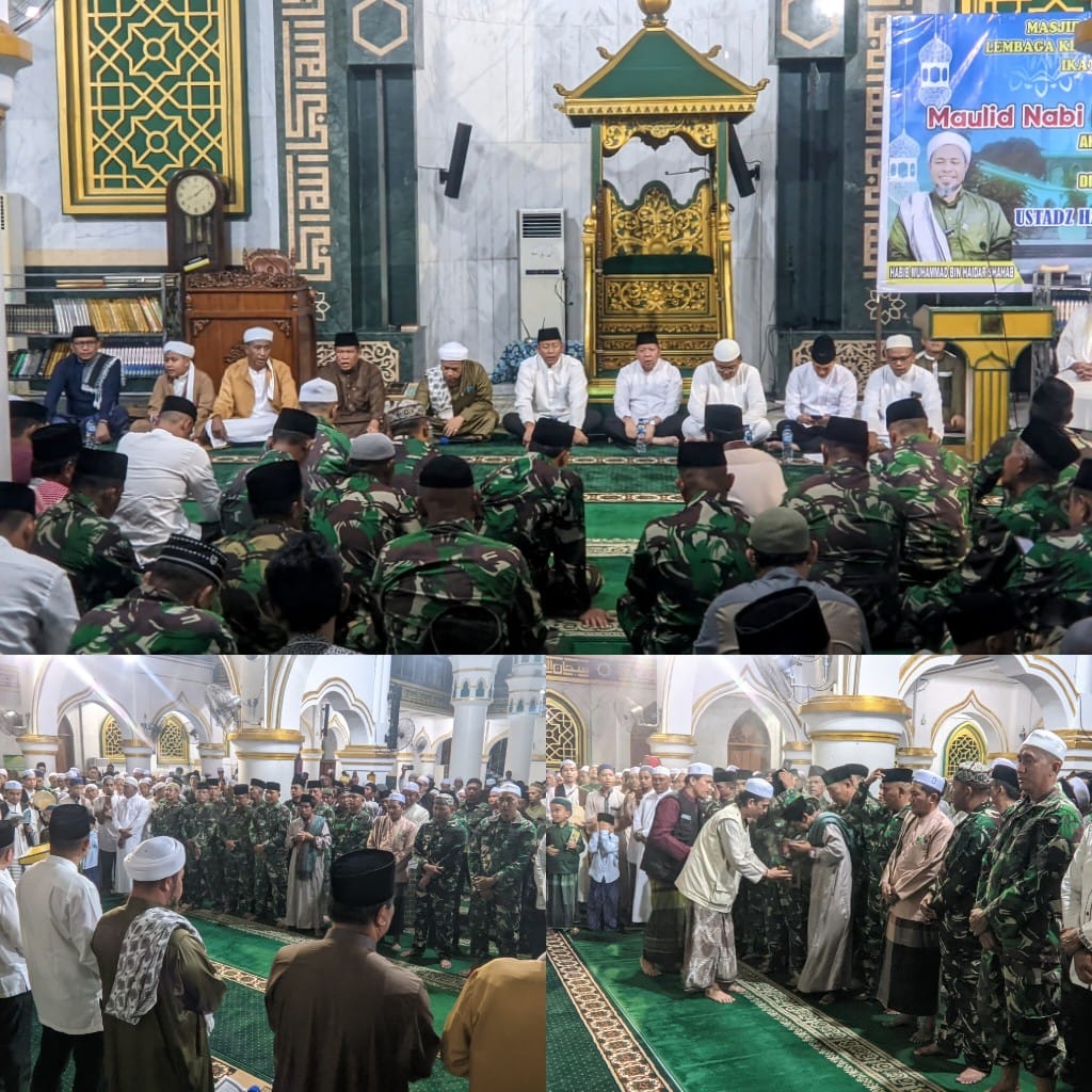 Kodim 0301/Pekanbaru bersama pengurus Masjid Raya Senapelan berkolaborasi menggelar kegiatan agama, memperingati maulid Nabi Muhammad SAW Minggu 24 September 2023 pukul 19.30.