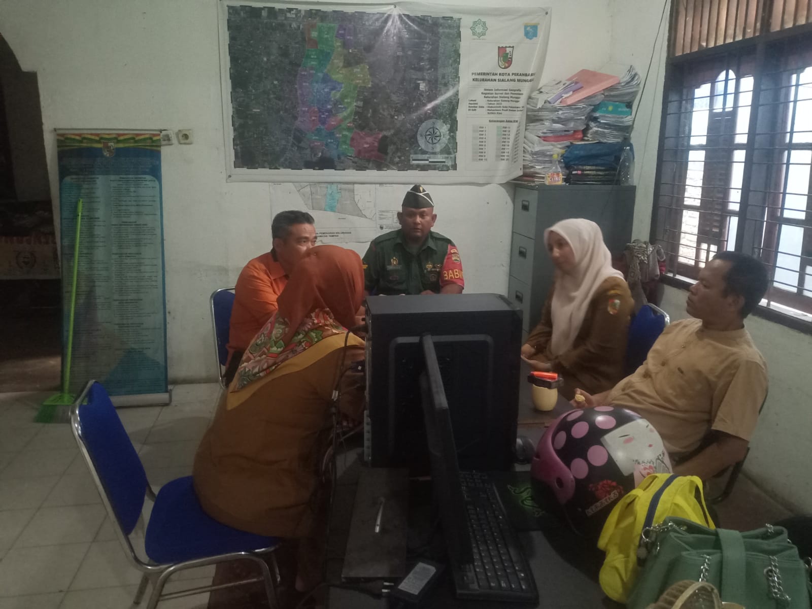 Bintara Pembina Desa (Babinsa) Koramil 06/Sukajadi Kodim 0301/Pekanbaru, Serka Kusman Darmanto melaksanakan komunikasi sosial dengan pelaku usaha, penjahit bordir Jalan Lili Kelurahan Kedung Sari Kecamatan Sukajadi, Kamis.