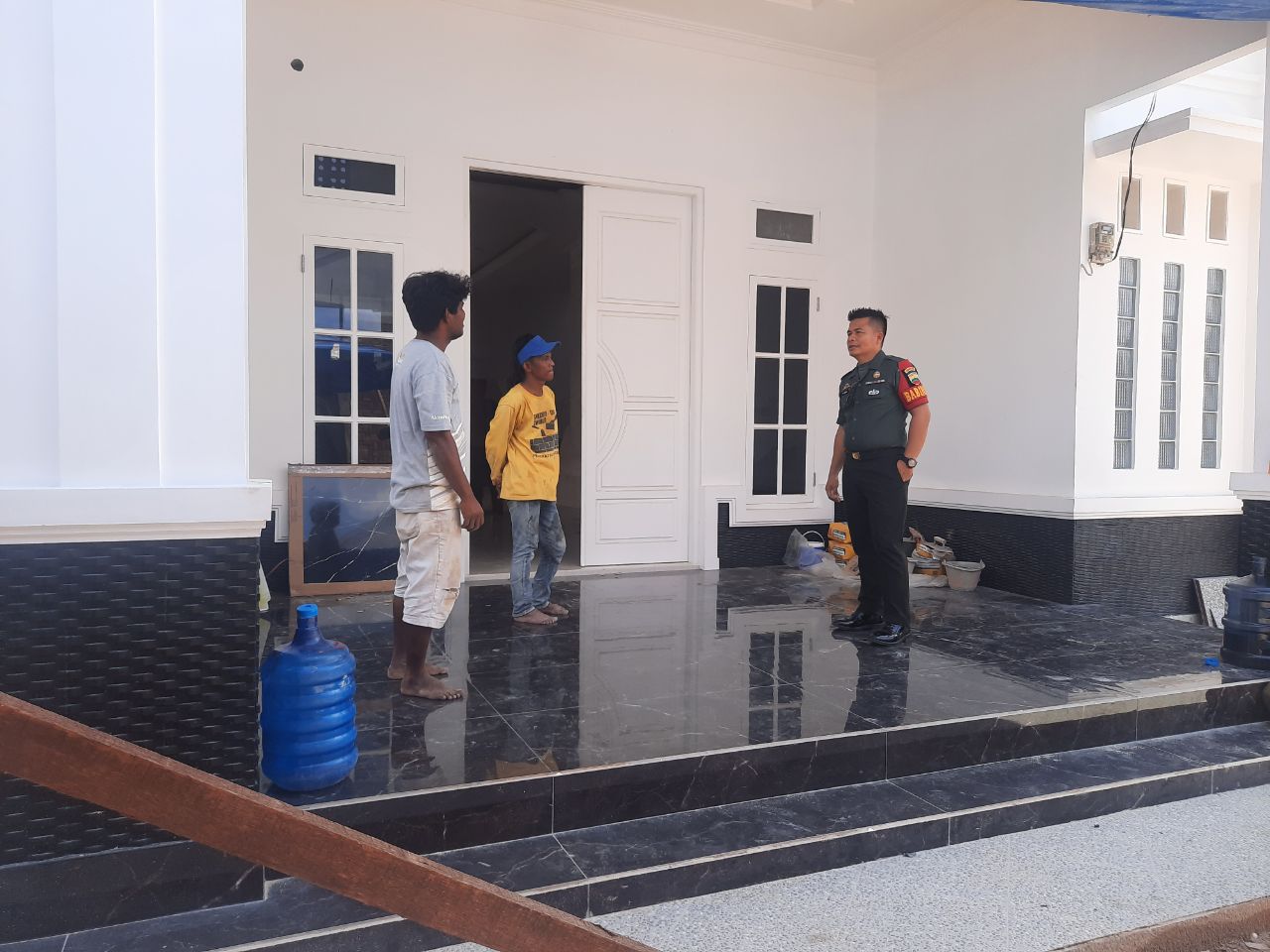 Babinsa Koramil 06/Sukajadi Kodim 0301/Pekanbaru, Serda GK Sinaga melaksanakan komunikasi sosial dengan masyarakat para pekerja yang sedang membangun rumah salah satu warga Ijep Kelurahan Sei Sibam Kecamatan Binawidya, Selasa.