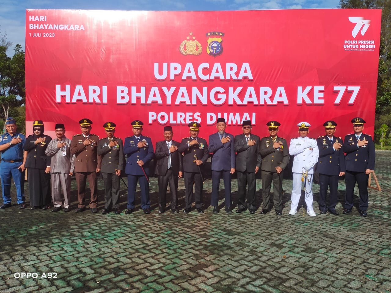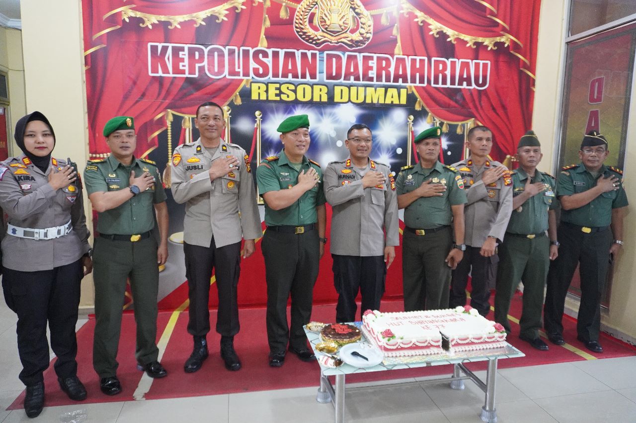 Komandan Kodim 0320/Dumai Letkol Inf Antony Tri Wibowo menghadiri upacara dan syukuran Hari Bhayangkara ke 77 tahun 2023 yang digelar di lapangan kantor Walikota Jalan Tuanku Tambusai Kelurahan Bagan Besar Kecamatan Bukit Kapur Kota Dumai, Sabtu.