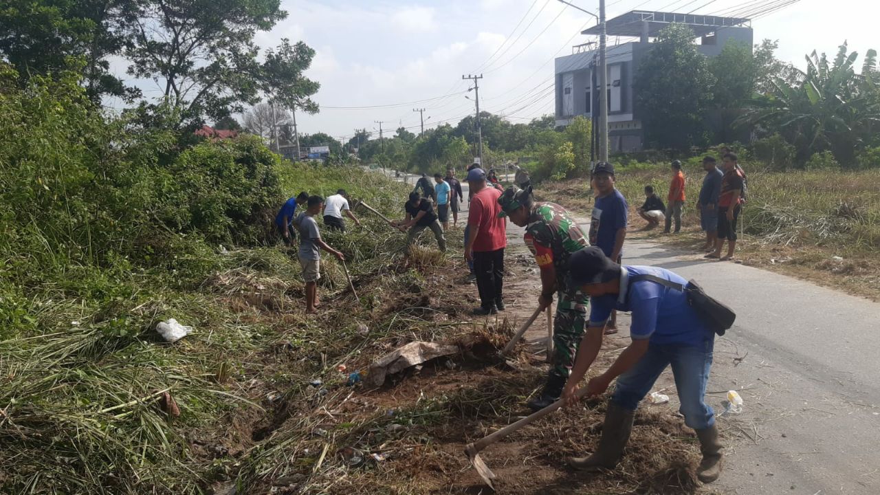 Bintara Pembina Desa (Babinsa) Koramil 06/Sukajadi Kodim 0301/Pekanbaru, Serda GK Sinaga bersama Pilar Kelurahan Sei Sibam dan warga melaksanakan gotong royong massal, Senin (03/07/2023) pukul 08.00.