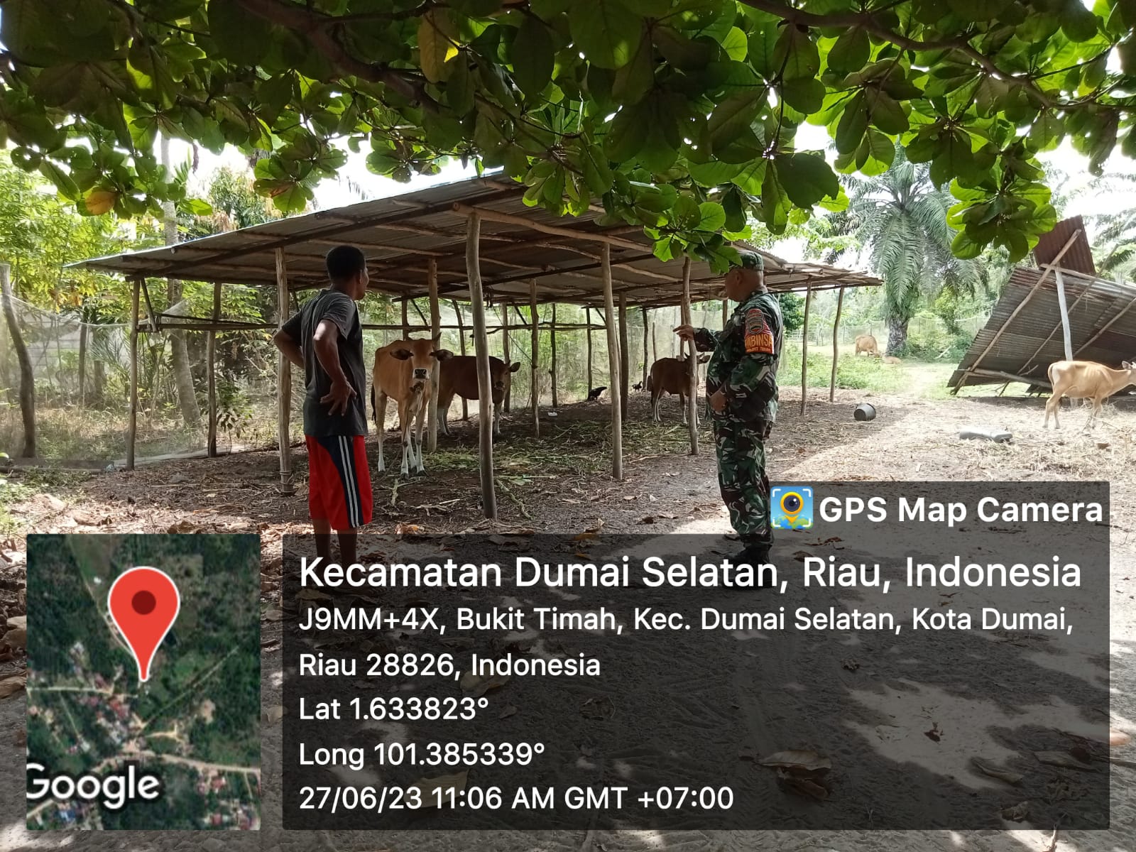 Babinsa Kodim 0320 Dumai, Serka Fahrizal Purba melaksanakan pemantauan, pendampingan terhadap peternak Sapi dan mensosialisasikan PMK (Penyakit Mulut dan Kuku), bertempat di Jalan Dang Merdu RT 05 Kel. Bukit timah Kecamatan Dumai.