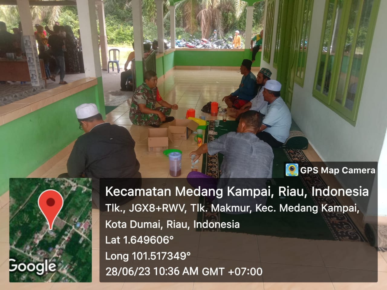 Bintara Pembina Desa (Babinsa) Kodim 0320/Dumai, Sersan Dua (Serda) Cerzakatno melaksanakan komunikasi sosial (Komsos) dengan tokoh masyarakat RT 02 Baharudin dan agama dan para warga.