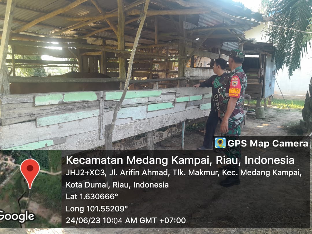 Babinsa Kodim 0320/Dumai, melaksanakan pemantauan pengecekan kesehatan terhadap ternak Sapi milik Wahyudi (33) di Jalan Arifin Ahmad Kelurahan Teluk Makmur Kecamatan Medang Kampai, Dumai, Sabtu.