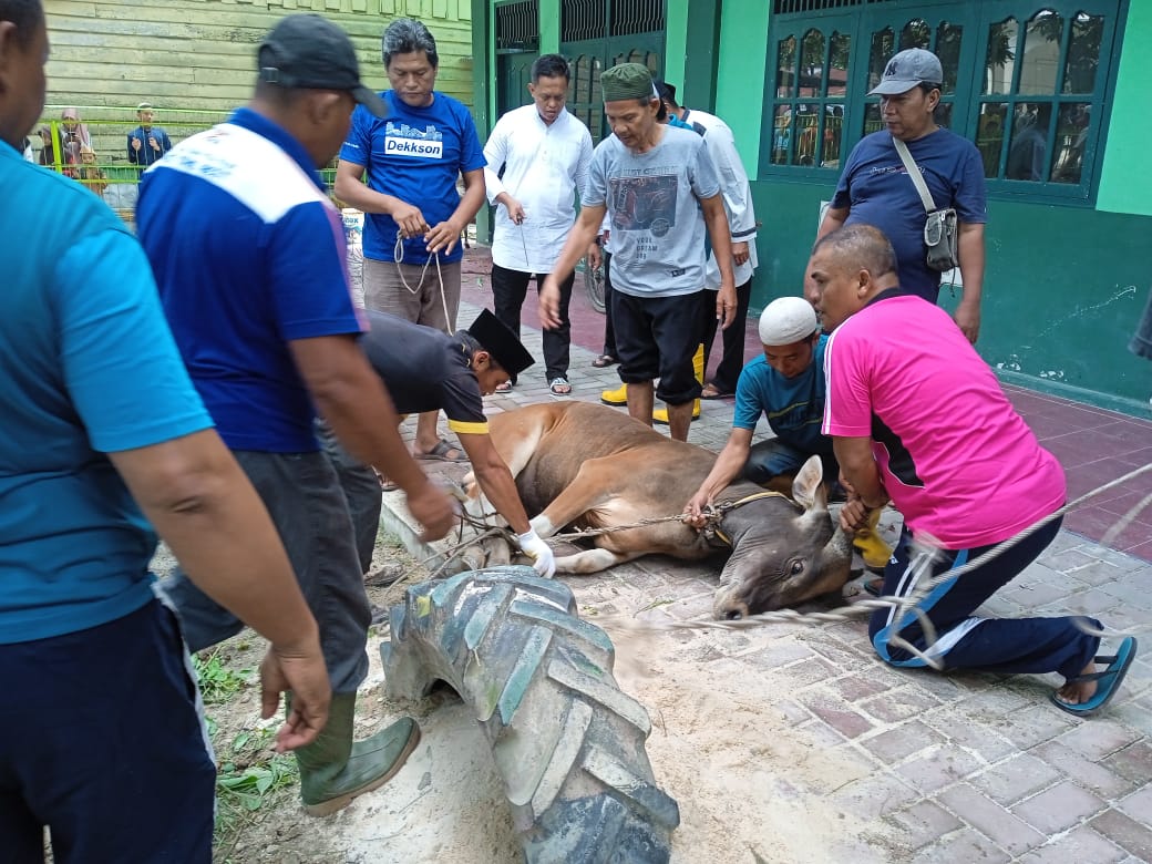 Komandan Kodim 0320/Dumai Letkol Inf Antony Triwibowo menyerahkan hewan kurban secara simbolis kepada panitia Idul Adha 1444 Hijriah di Masjid Al Firman Komplek Kodim 0320 Dumai, Kamis (29/06/2023)..