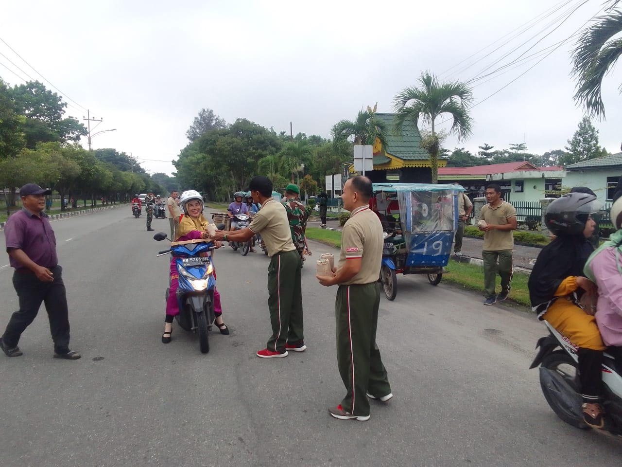 Ratusan nasi bungkus dibagikan Dandim dan anggota Kodim 0320/Dumai kepada pengguna sepeda motor, tukang becak dan tukang ojek online yang melintasi di depan Makodim Jalan Sultan Syarif Kasim Kelurahan Teluk Binjai Kecamatan Dumai Timur, Jumat,.
