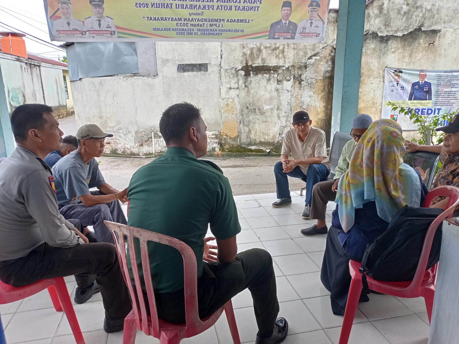 Babinsa Koramil 06/Sukajadi Kodiim 0301/Pekanbaru, Sertu Arman bersama Bhabinkamtibmas melaksanakan komsos bersama warga Jalan Cipta Karya Kelurahan Sialang Munggu Kecamatan Tuah Madani, Senin.