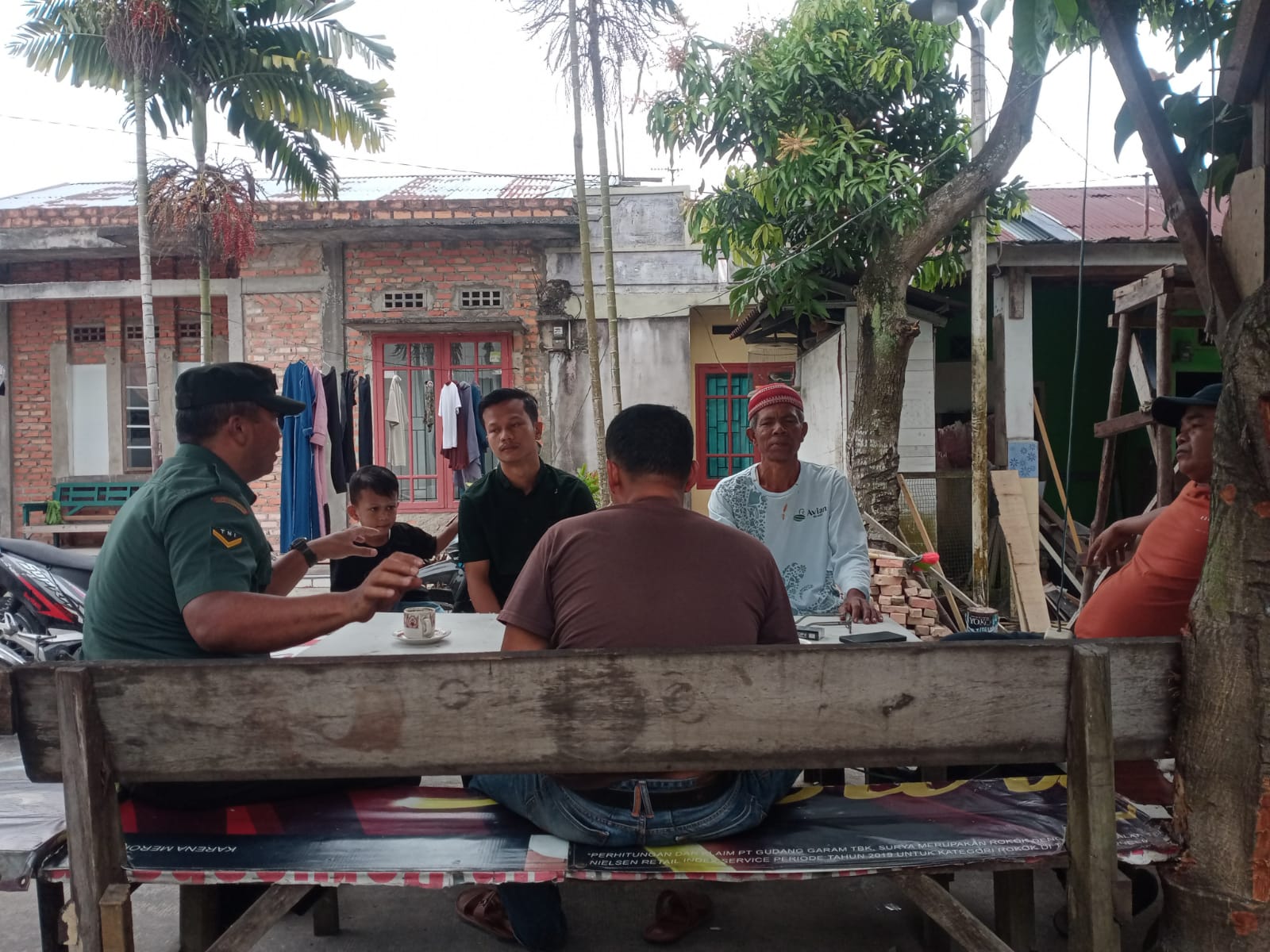 Bintara Pembina Desa (Babinsa) Koramil 06/Sukajadi Kodim 0301/Pekanbaru, Sertu Jhoni Janan melaksanakan komunikasi sosial sambil makan siang bersama Ketua Pemuda dan warga Jalan Ahmad Yani RT 02 RW 02 Kelurahan Pulau Karomah Kecamatan Sukajadi,.
