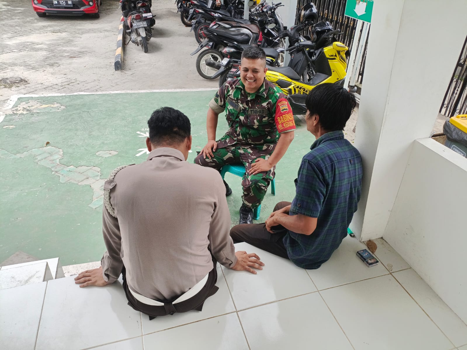 Babinsa Serka Kusman Darmanto Koramil 06/Sukajadi Kodim 0301/Pbr melaksanakan Komsos dengan Security Parhan dan pegawai Pertagas Anto di Jalan Melur Kelurahan Kedungsari Kecamatan.