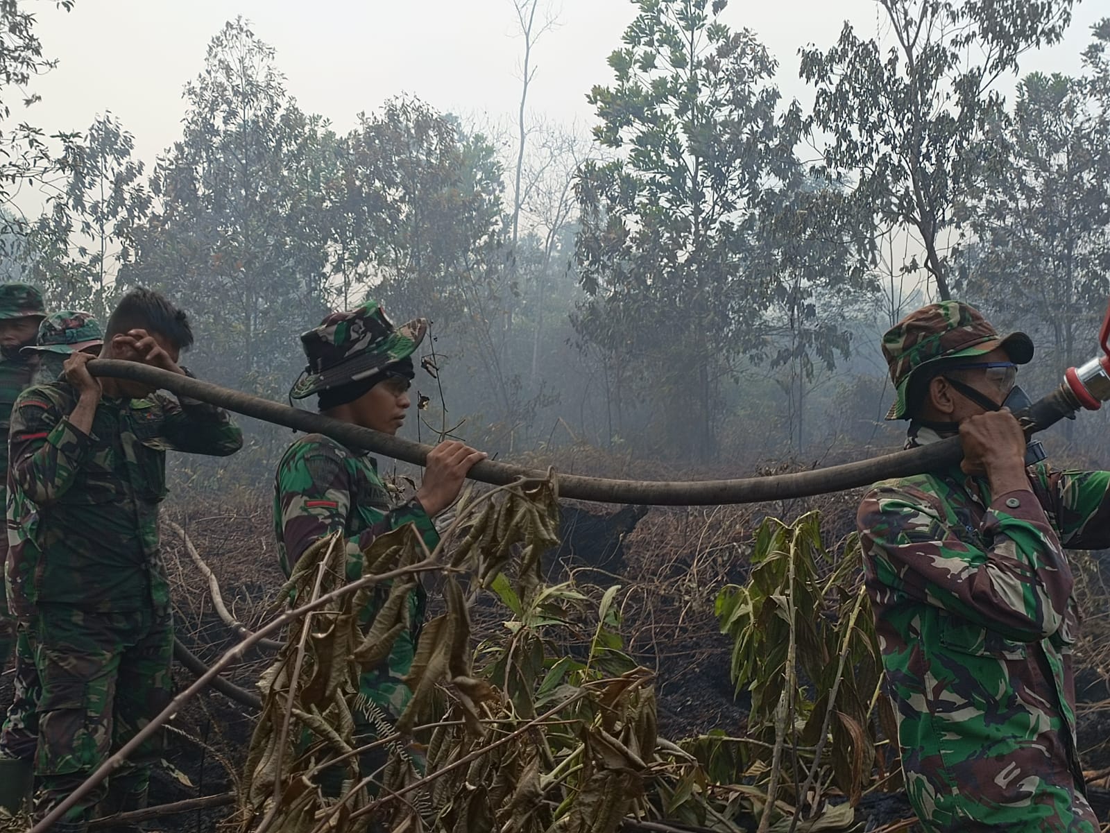 Lebaran Idul Fitri hari kedua, Personil Kodim 0320/Dumai bersama petugas gabungan masih berjibaku memadamkan dan pendinginan kebakaran hutan dan lahan di wilayah Jalan Parit Purba Kelurahan Pelintung Kecamatan Medang Kampai, Minggu.