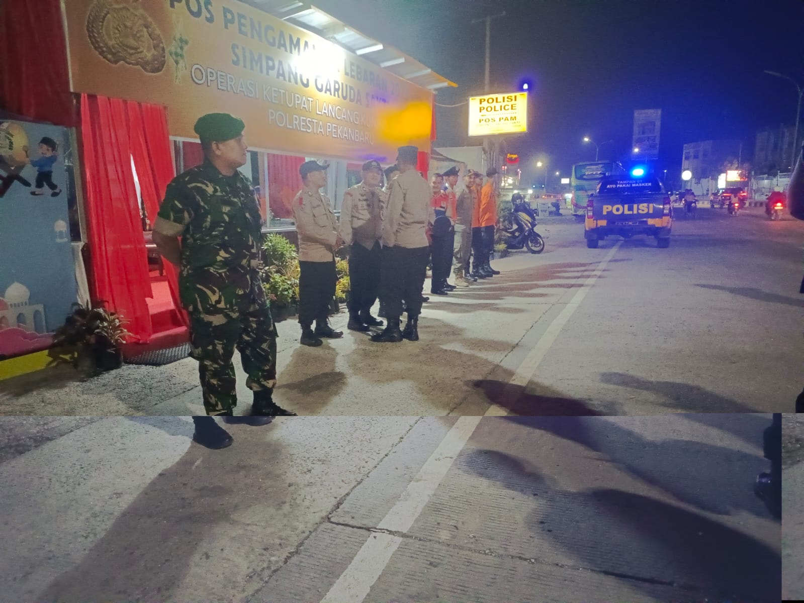Serka Kusman dan Sertu Parjo, Dua Anggota TNI AD jajaran Koramil 06/Sukajadi Kodim 0301/Pbr melaksanakan pengamanan Idul Fitri Operasi Ketupat Lancang Kuning Tahun 2023 di Jalan H R Soebrantas Kelurahan Tuah Madani Kecamatan Tuah Madani, Jumat malam.
