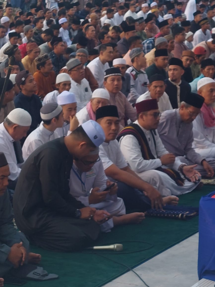 Komandan Kodim 0320/Dumai Letkol Arh Hermansyah Tarigan, SE bersama ribuan jamaah ikut melaksanakan sholat Idul Fitri di Masjid Islamic Center, Jalan H.R Soebrantas Kelurahan Teluk Binjai Kecamatan Dumai Timur, Sabtu.