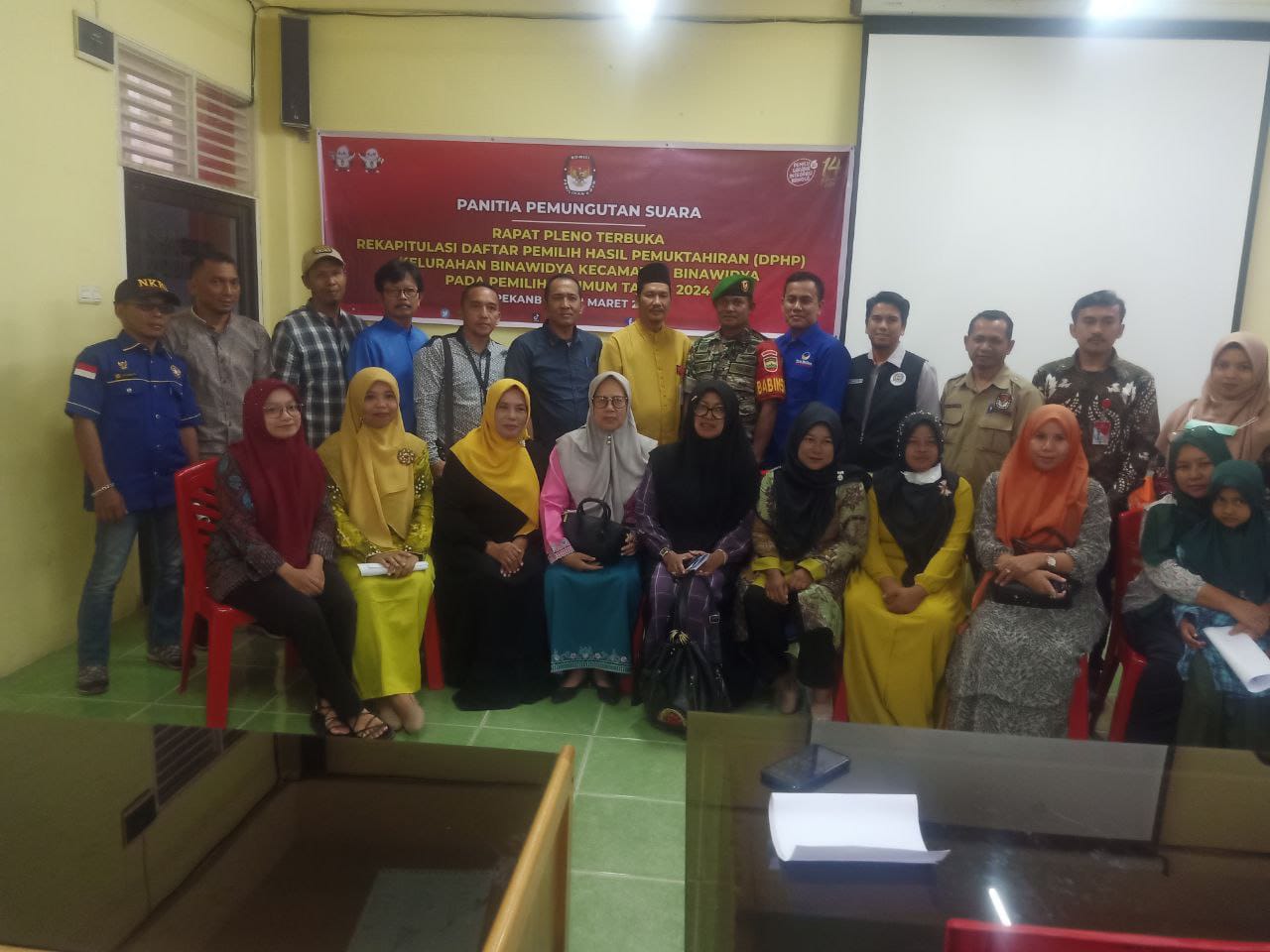 Babinsa Koramil 06 Sukajadi Kodim 0301 Pbr, Sertu Asy'ari menghadiri rapat pleno terbuka rekapitulasi Daftar Pemilih Hasil Pemuktahiran (DPHP) Kelurahan Binawidya pada pemilu tahun.