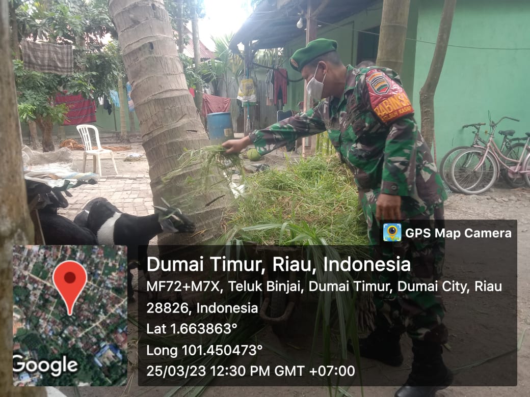 Upaya pencegahan wabah penyakit mulut dan kuku (PMK) terhadap hewan ternak, Babinsa Kodim 0320/Dumai, Serda SMP Sinaga melakukan sosialisasi, pengecekan dan pemantauan terhadap hewan ternak Kambing milik Harahap, warga gang Galon Kelurahan Teluk.