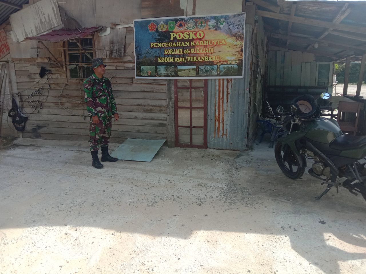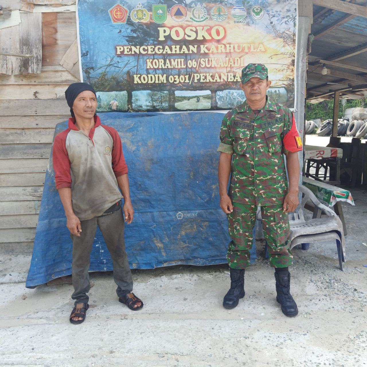 Babinsa Koramil 06/Sukajadi Sertu Asyari melaksanakan patroli dan sosialisasi cegah Karhutla, di Jalan Air Hitam RT 01 RW 02 Kelurahan Sei Sibam Kecamatan Binawidya, Sabtu.