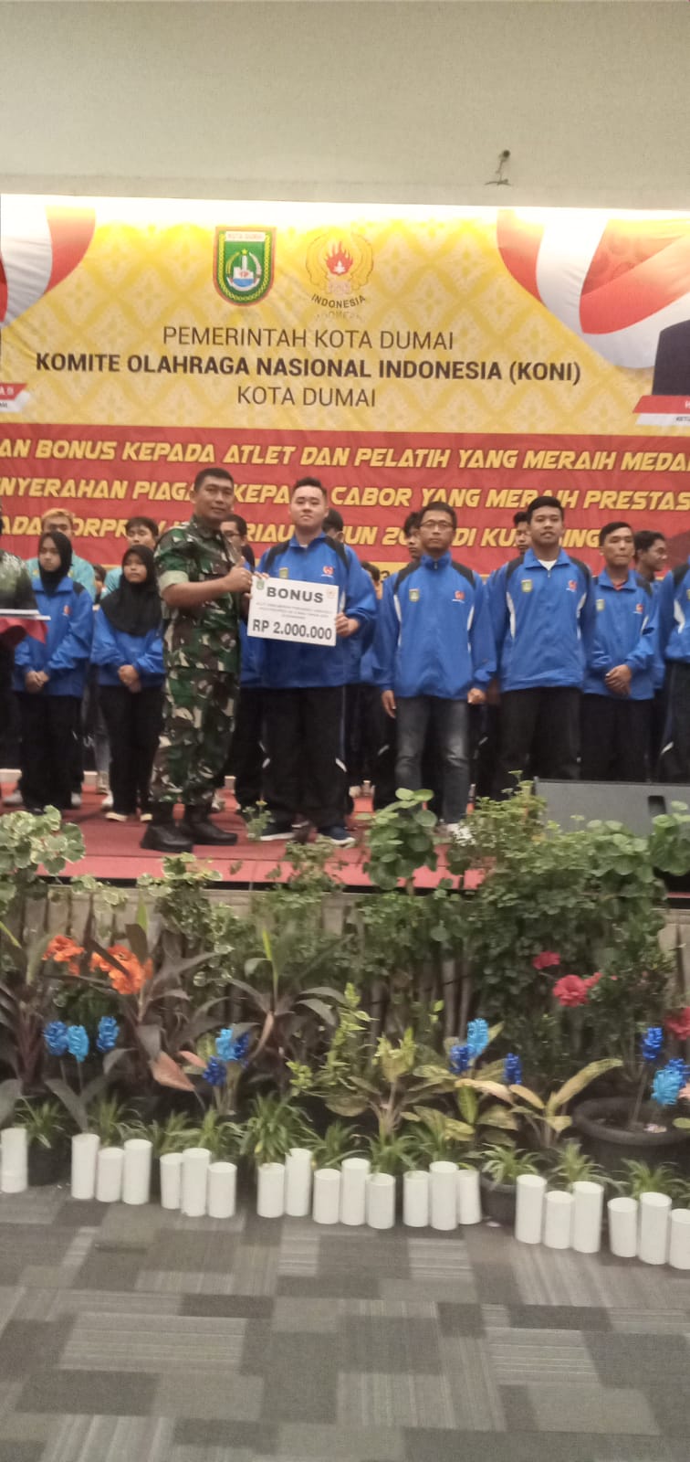 Komandan Kodim (Dandim) 0320/Dumai Letkol Arh Hermansyah Tarigan, SE, hadir dan memberikan piagam dan bonus kepada Atlet dan Pelatih dalam Pekan Olahraga Provinsi (Porprov) Riau ke x tahun 2022 di Kabupaten Kuansing yang.