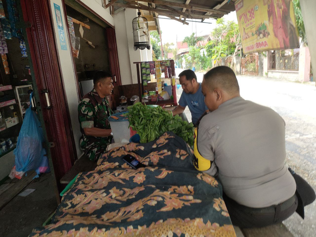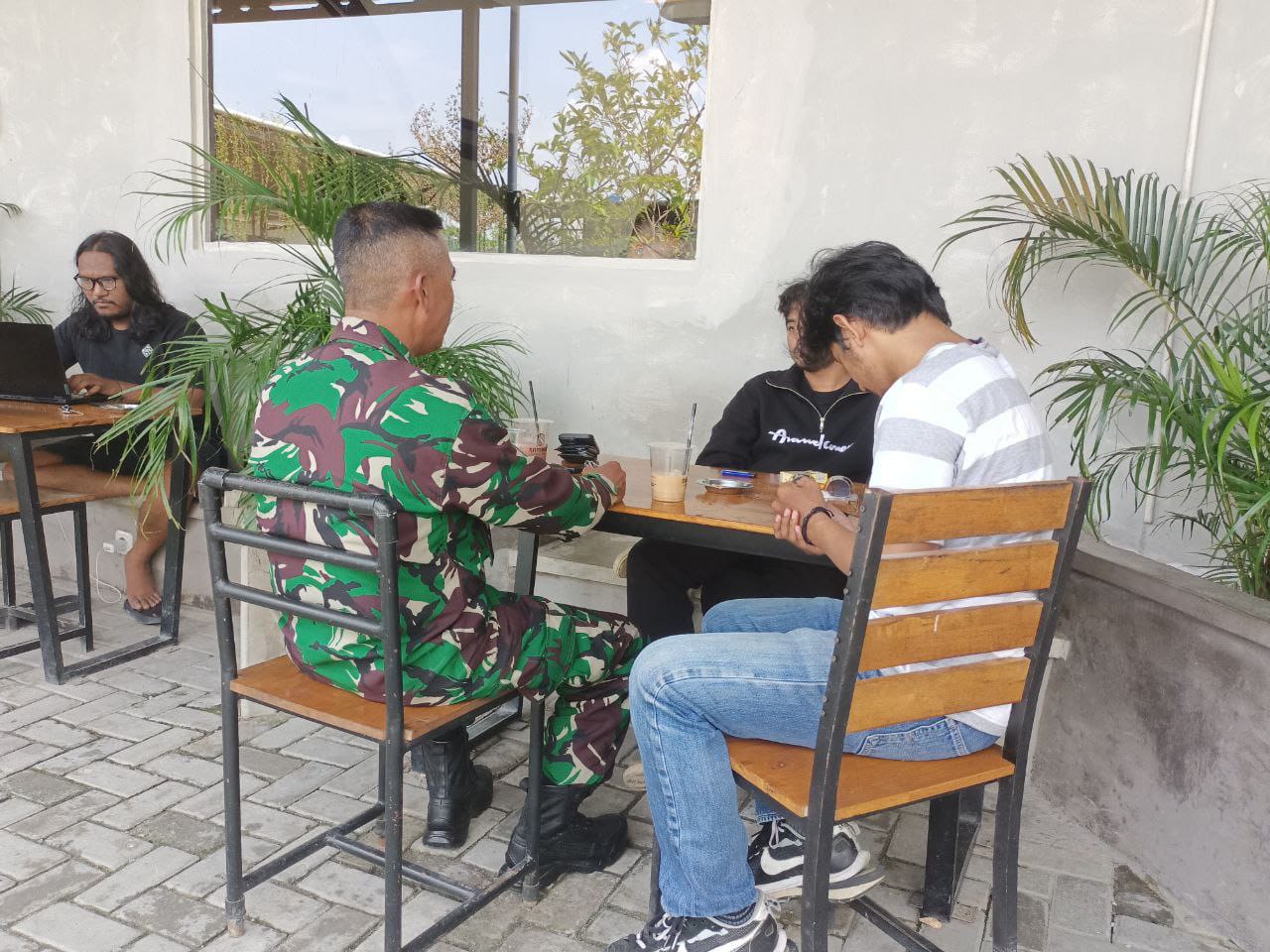 Serka J Tanjung, Babinsa Koramil 06/Sukajadi Kodim 0301/Pbr melaksanakan komsos bersama Ketua Pemuda RW 01 Reno di salah satu kedai kopi Jalan Purwodadi Kelurahan Sidomulyo Barat Kecamatan Tuah Madani Kota Pekanbaru, Minggu.