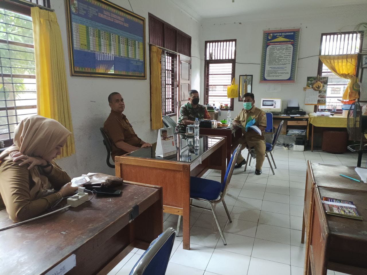 Babinsa Serka Kusman Darmanto Koramil 06/SKJ Kodim 0301/Pbr melaksanakan Komsos dengan Staf Kelurahan di Jalan Melur Kelurahan Kedungsari Kecamatan Sukajadi Kota Pekanbaru, Kamis.