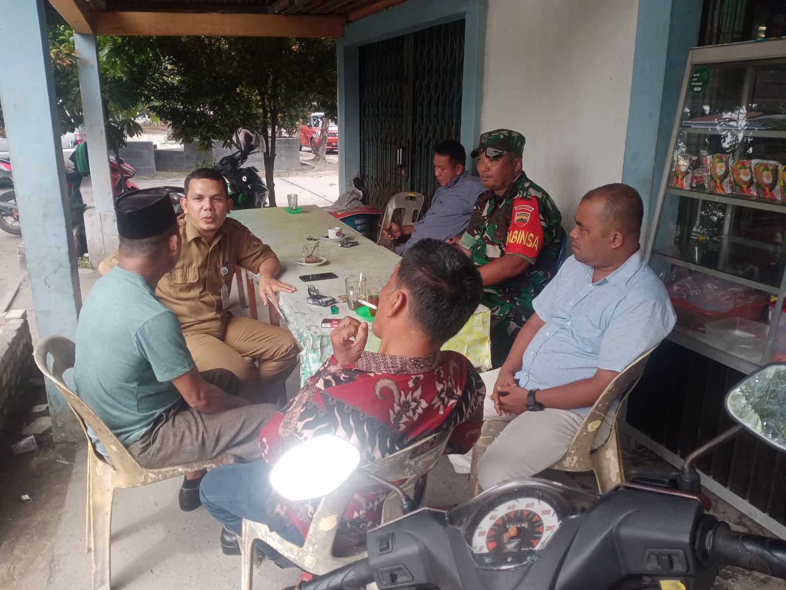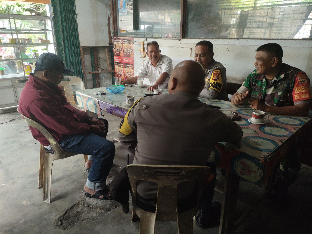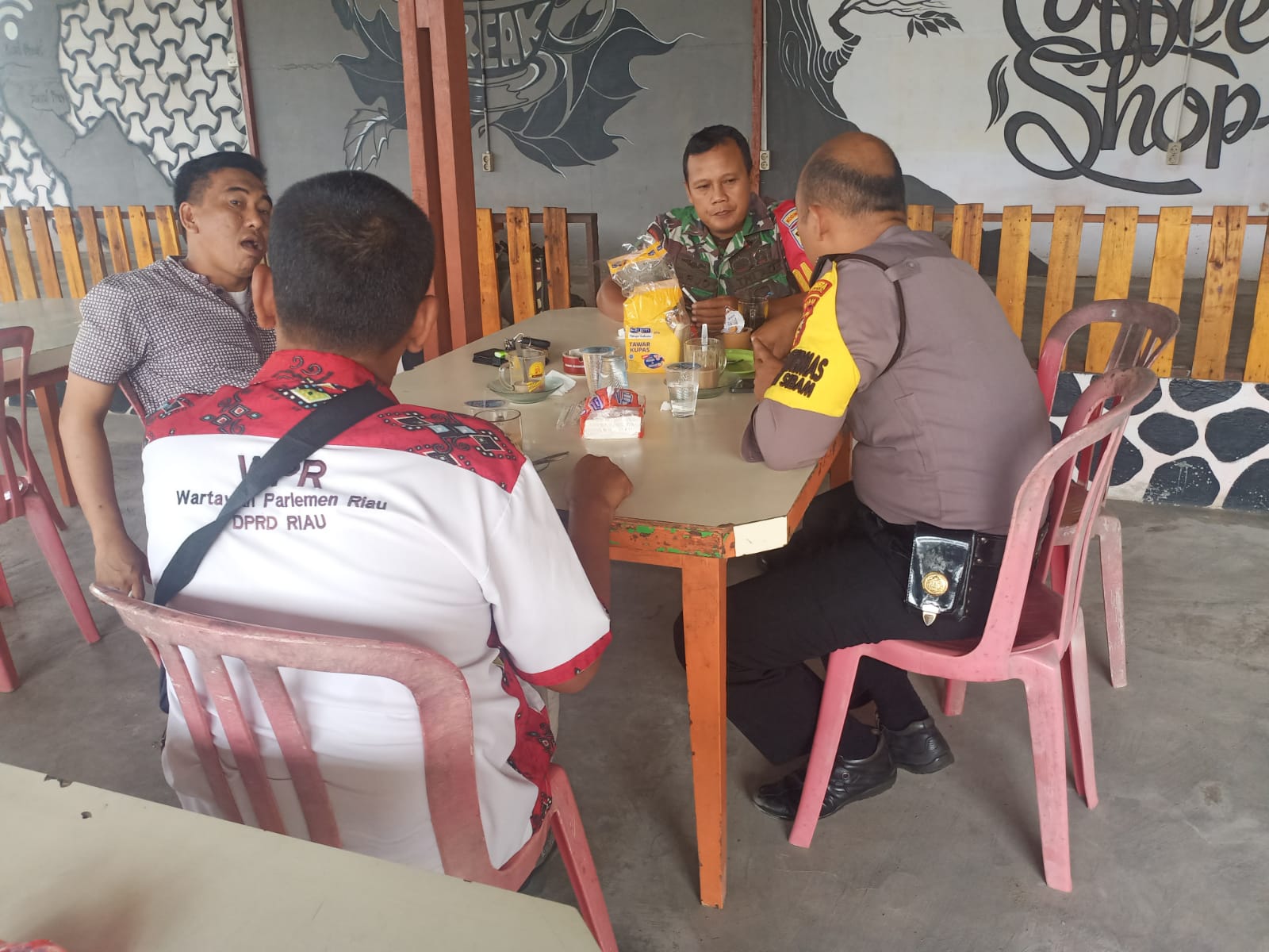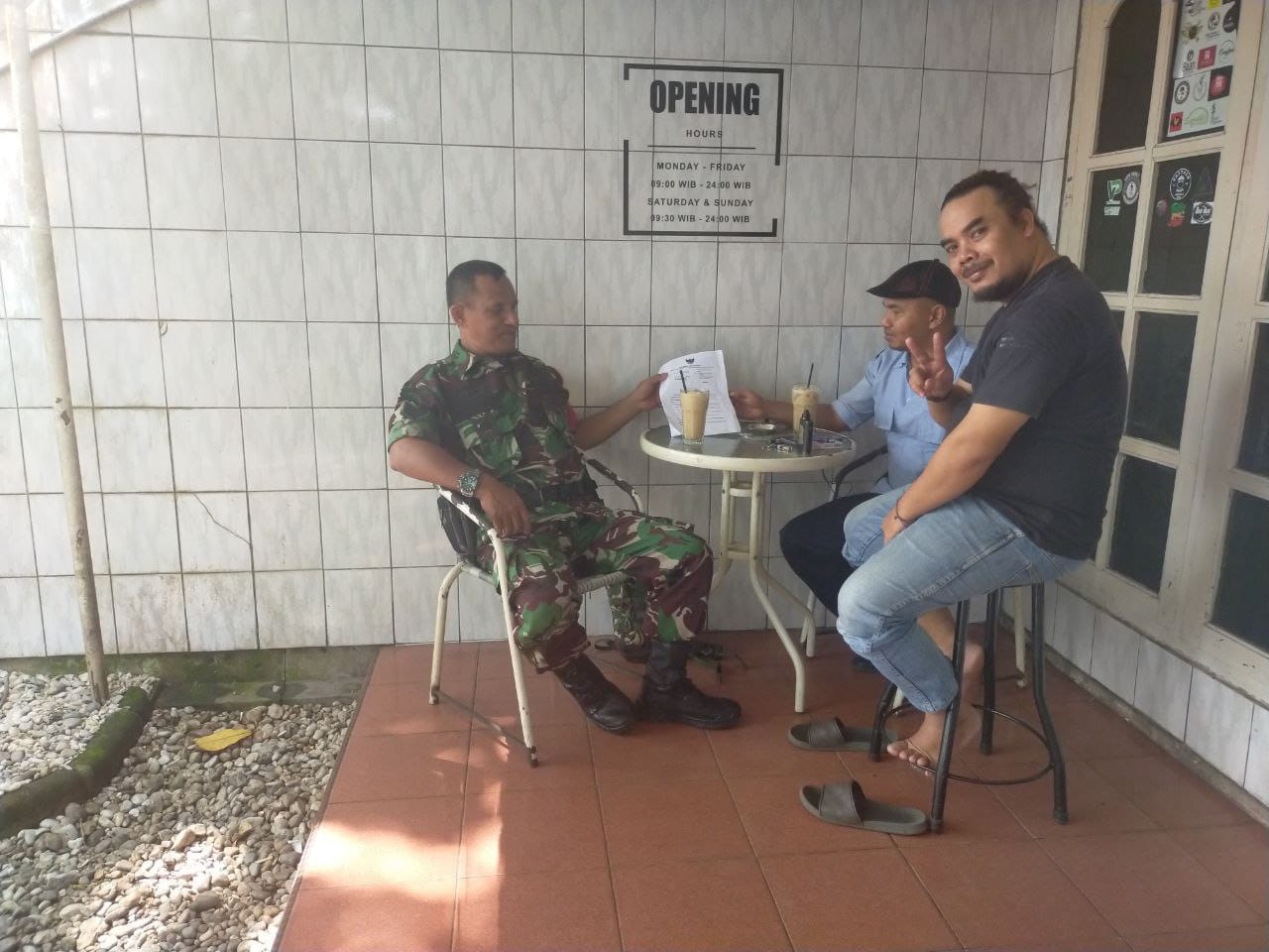 Babinsa Koramil 06/Sukajadi Kodim 0301/Pbr, Serka Nasaruddin bersama Bhabinkamtibmas Polsek Tampan melaksanakan Komsos dengan Ketua Pemuda Johanes disalah satu kedai kopi Jalan HR Soebrantas Kelurahan Tuah Karya Kecamatan Tuah Madani, Pekanbaru,.