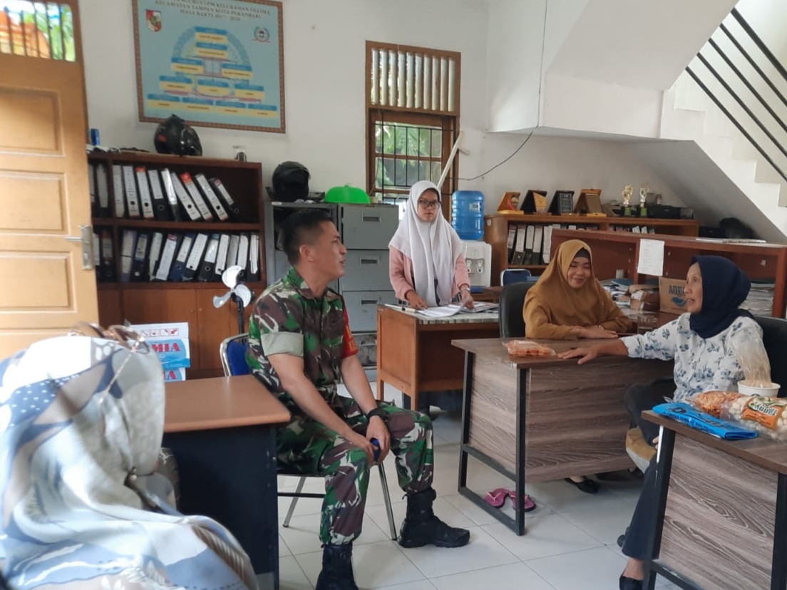 Bertempat di Kantor Kelurahan Delima, Babinsa Koramil 06/Sukajadi Kodim 0301/PBR, Serka Toni Efendi melaksanakan kegiatan rutin yang menjadi salah satu bagian tugas pokoknya yaitu melakukan interaksi secara langsung dengan Lurah diwakili Kasi Kesra.