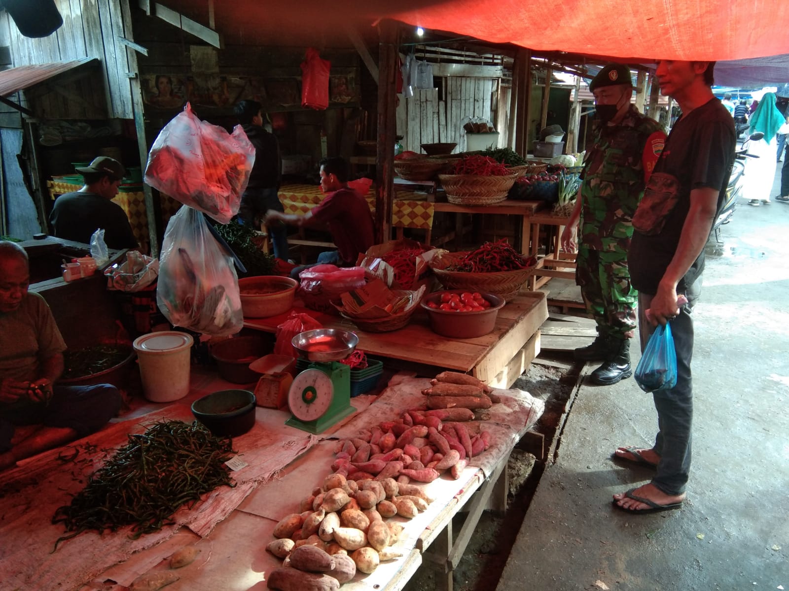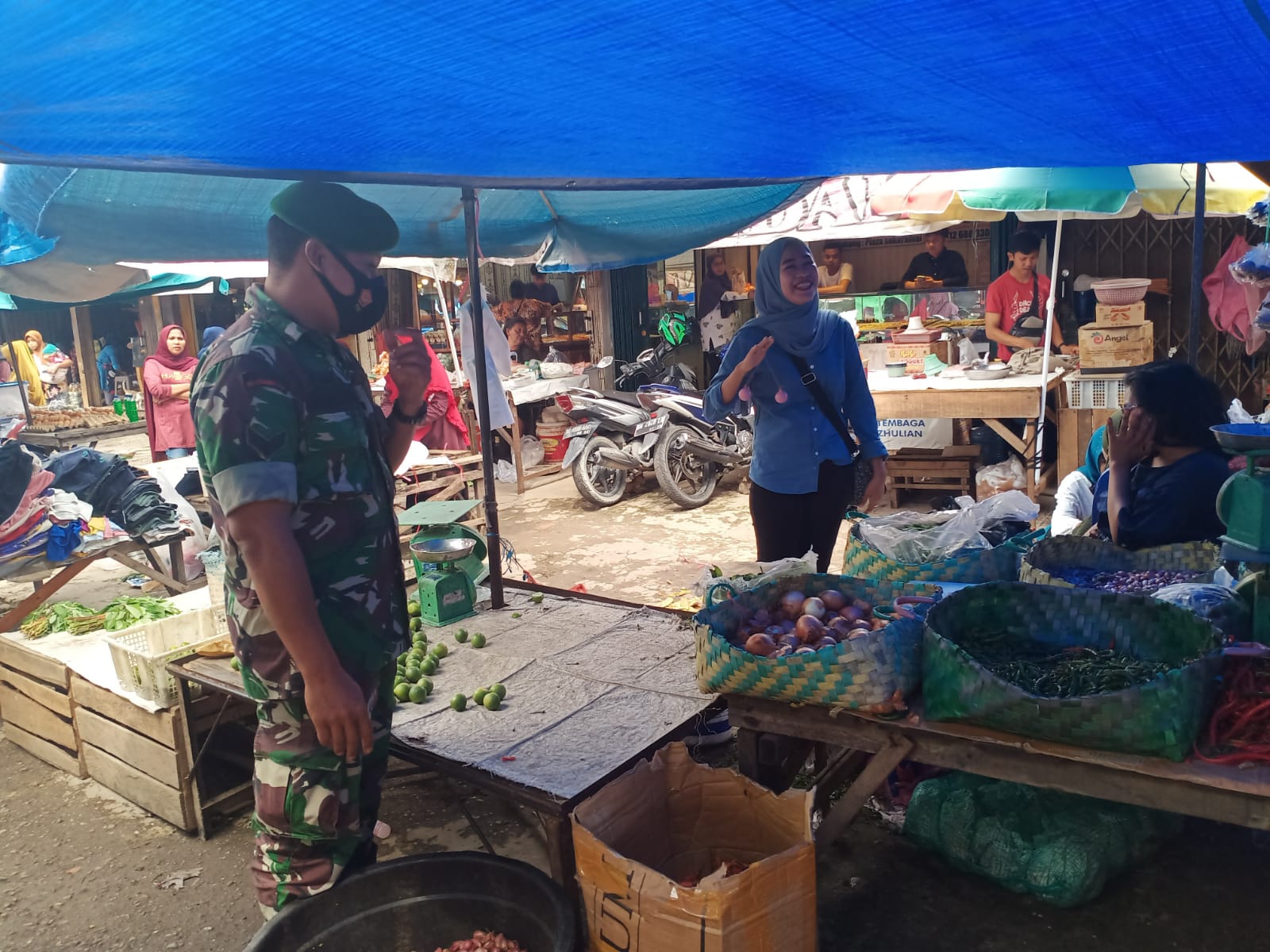 Peduli terhadap kesehatan pedagang dan pengunjung pasar Cik Puan, Anggota Koramil 06/Sukajadi Kodim 0301/PBR, Sertu Parjo lakukan blusukan ke area pasar untuk memberikan imbauan tentang Protokol.
