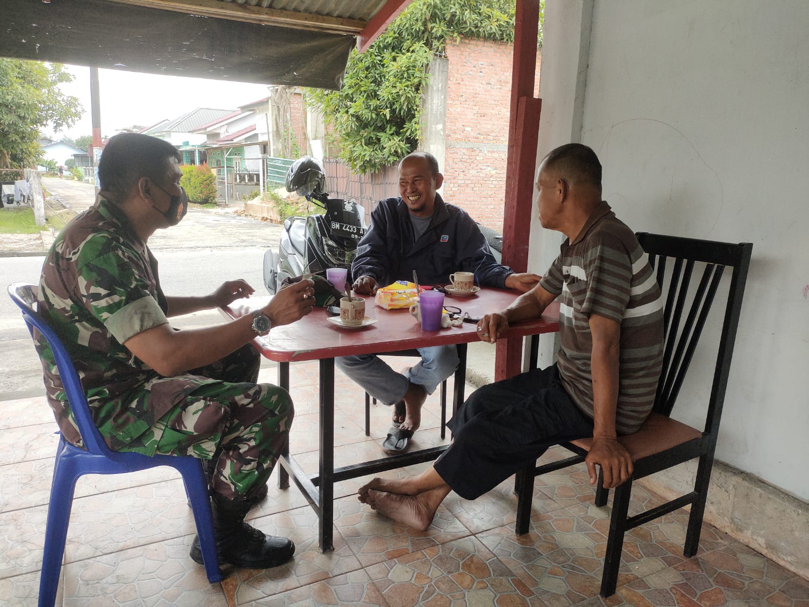 Babinsa Koramil 06/Sukajadi Kodim 0301/PBR, Serka Nasaruddin melaksanakan komunikasi sosial dengan mantan ketua RW 04 Tam Khairul dan Ketua Pemuda Sani di Jalan Saiyo Kelurahan Tuah Karya Kecamatan Tuah Madani, Sabtu.