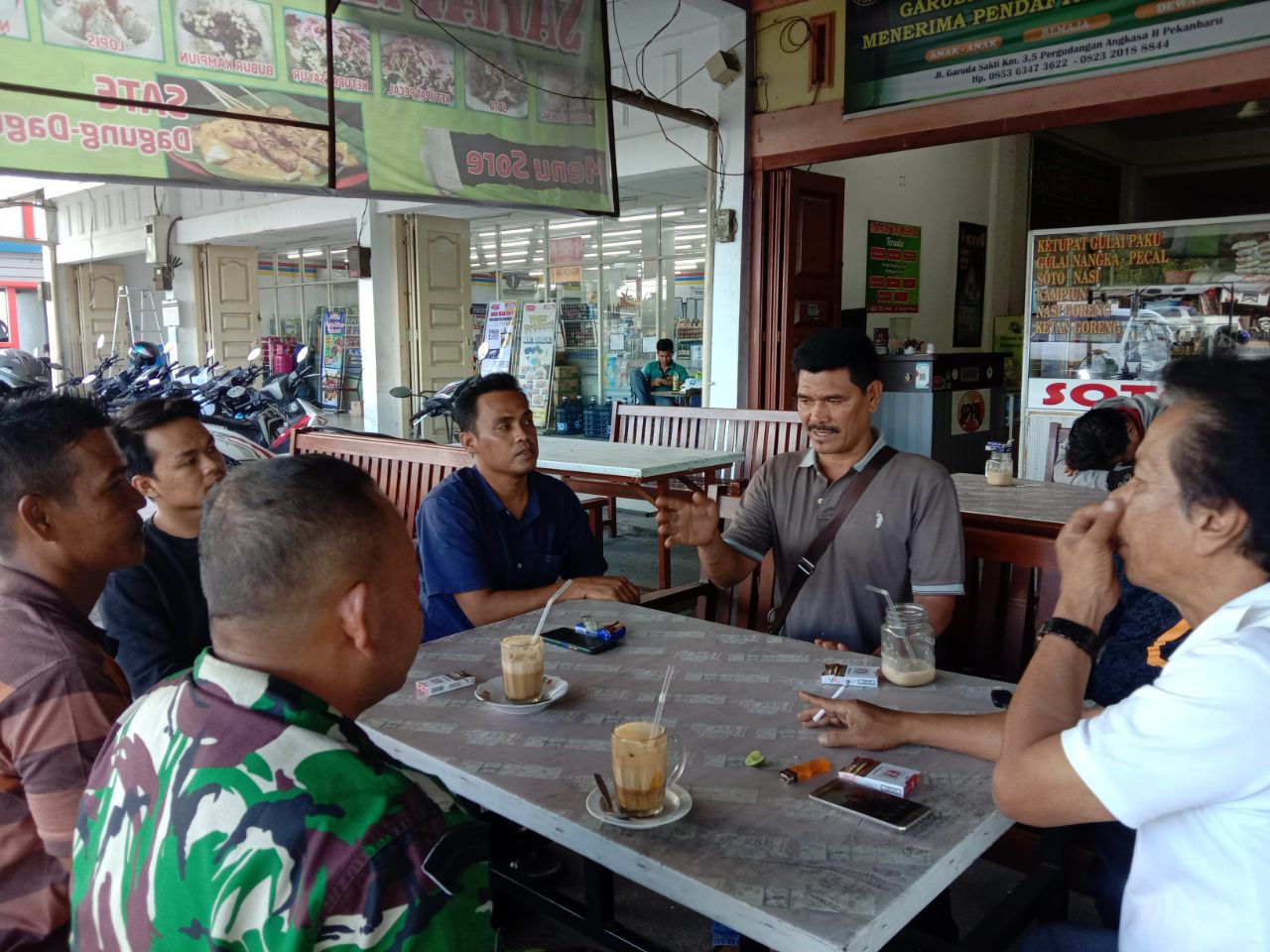 Babinsa Koramil 06/Sukajadi Kodim 0301/PBR, Sertu Parjo melaksanakan Komsos bersama Ketua RW 01 Zulfahmi di warung warga milik bude Murni Jalan Rajawali Kelurahan Harjosari Kecamatan Sukajadi Pekanbaru, Rabu.