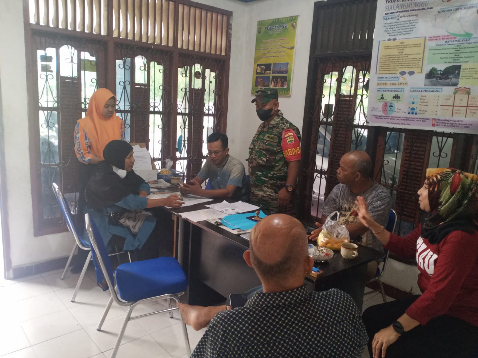 Babinsa Koramil 06/Sukajadi Kodim 0301/PBR, Serda Arman melaksanakan komunikasi sosial dengan perangkat Kelurahan dan pemuka masyarakat di Jalan Cipta Karya gang Lumba- lumba Kelurahan Tuah Madani Kecamatan Tuah Madani, Jumat.