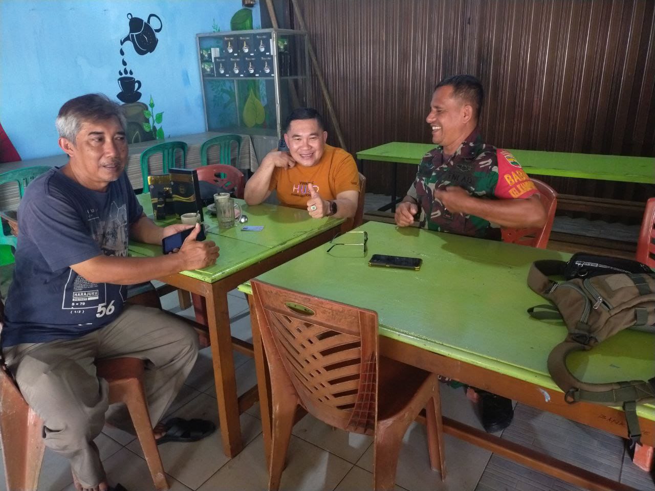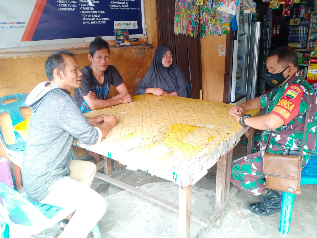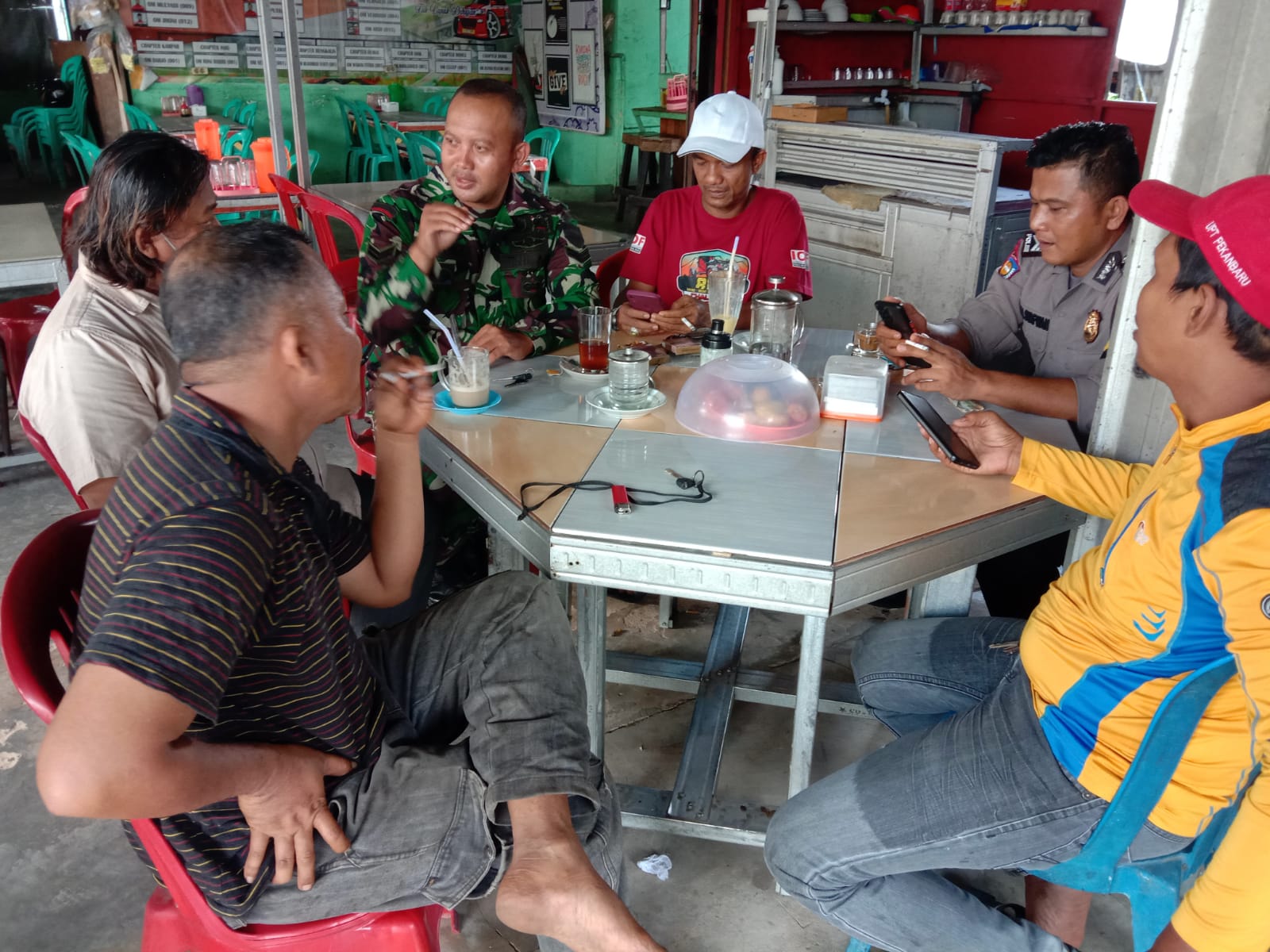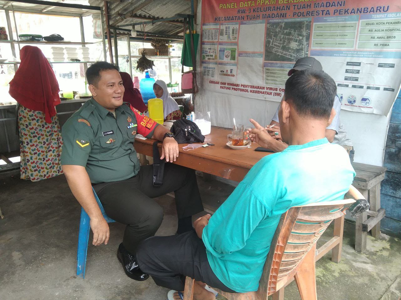 Serka J Tanjung, Babinsa Koramil 06/Sukajadi Kodim 0301/PBR melaksanakan komsos bersama Ketua RT 04 Ahmad Adi dan Ketua Siskamling Irwandi di salah satu warung Jalan Melur Kelurahan Sidomulyo Barat Kecamatan Tuah Madani, Kamis.