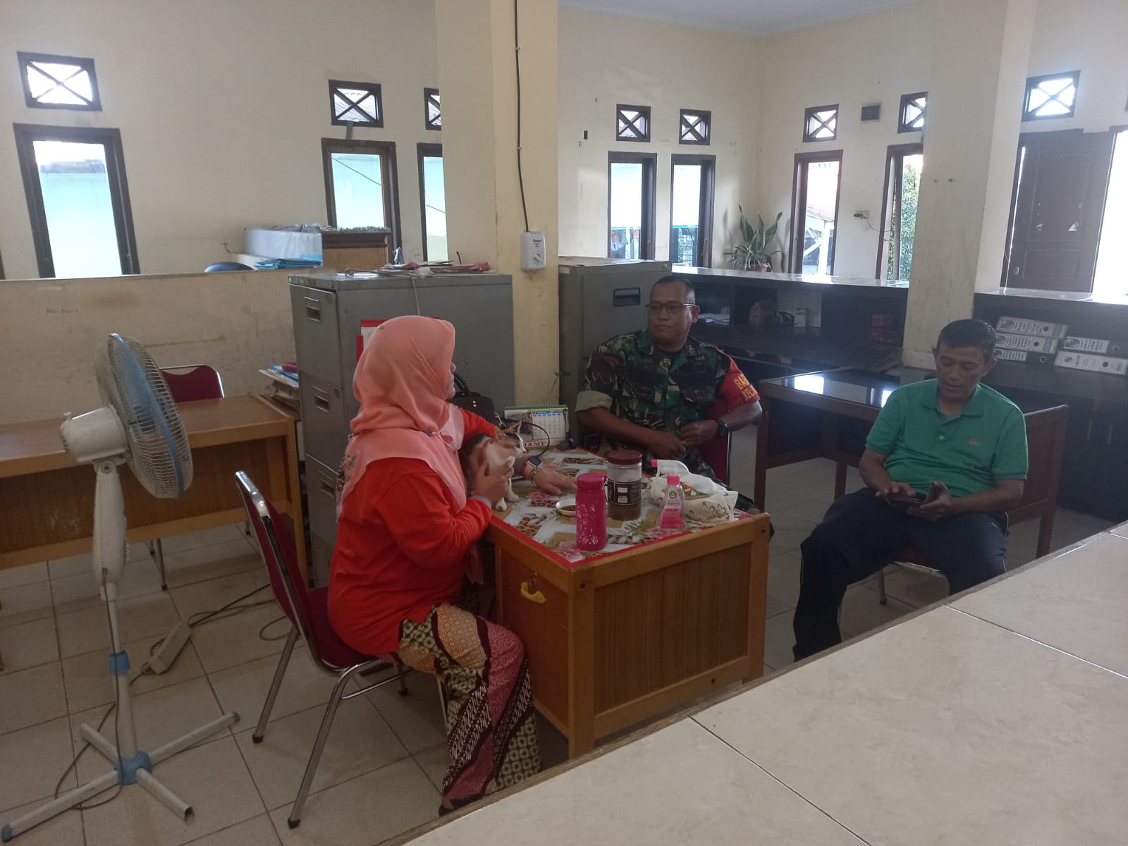 Babinsa Koramil 06/Sukajadi Kodim 0301/PBR, Serma Budi Mulia melaksanakan komunikasi sosial bersama Sekretaris Kelurahan, Ospendi dan Kasi Kesra Devy Sandra di Kantor Kelurahan Jadirejo Jalan Kesuma, Kecamatan Sukajadi Kamis.