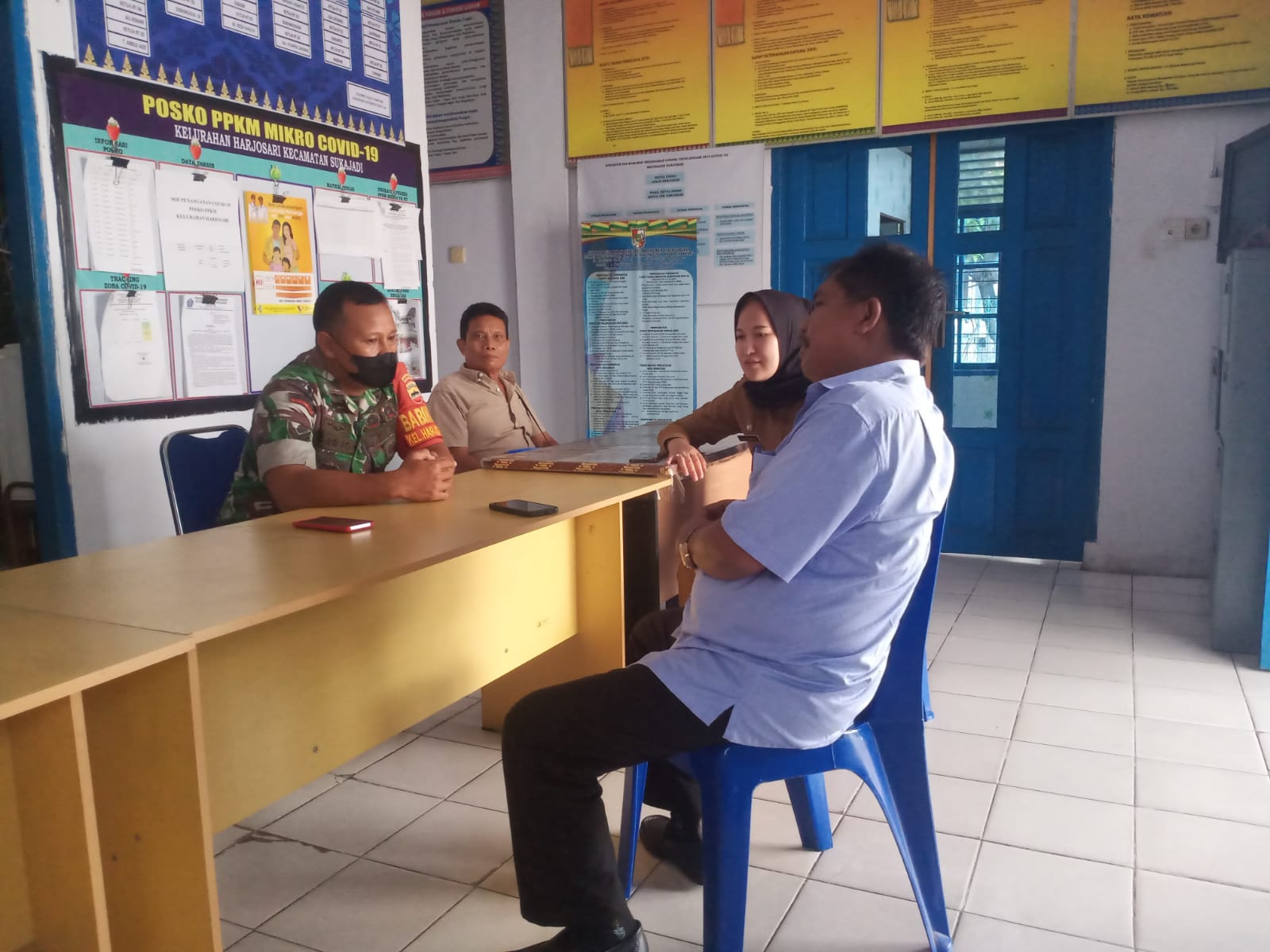 Babinsa Koramil 06/Sukajadi Kodim 0301/Pbr, Sertu Parjo melaksanakan Komsos dengan Lurah Mutia Pratama Rozi, Sekretaris Kelurahan Gusnihayati, Ketua RT 01 Mulatua dan Ketua RT 03 Reza Fahlevi dikantor Kelurahan Harjosari, Jalan Bunga Kertas,.