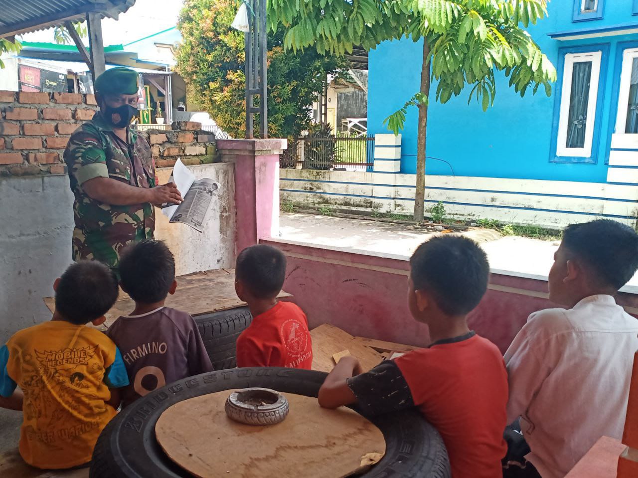 Bintara Pembina Desa (Babinsa) Koramil 06/Sukajadi Kodim 0301/PBR, Serda Arman tiada henti - hentinya mengajarkan membaca, menulis secara berhitung kepada anak-anak di Kampung Pancasila Jalan Cipta Karya RT 02 RW 10 Kelurahan Sialang Munggu.
