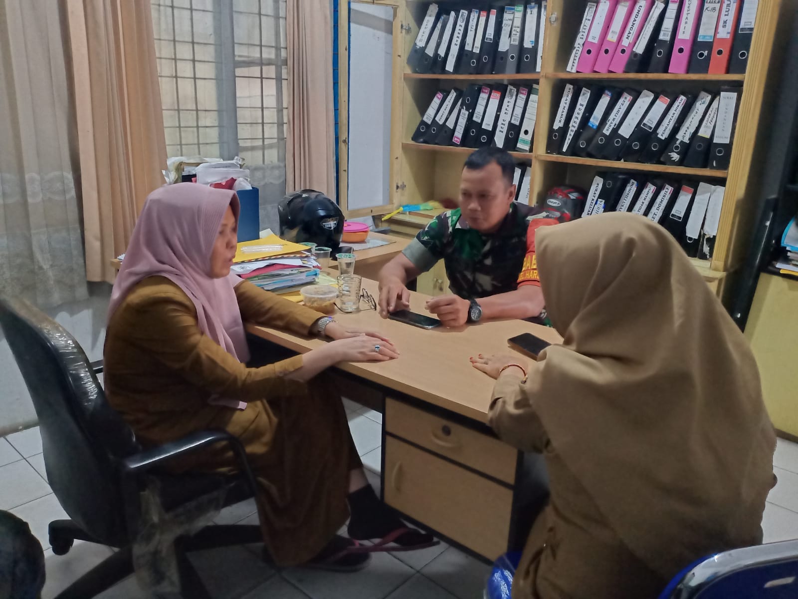 Sertu Parjo, Babinsa Koramil 06/Skj Kodim 0301/Pekanbaru melaksanakan Komsos bersama Kasi Kessos Nurhayati dan Kasi PPM Nurihawaty di Kantor Kelurahan Harjosari Jalan Bunga Kertas Kecamatan Sukajadi Kota Pekanbaru, Senin.