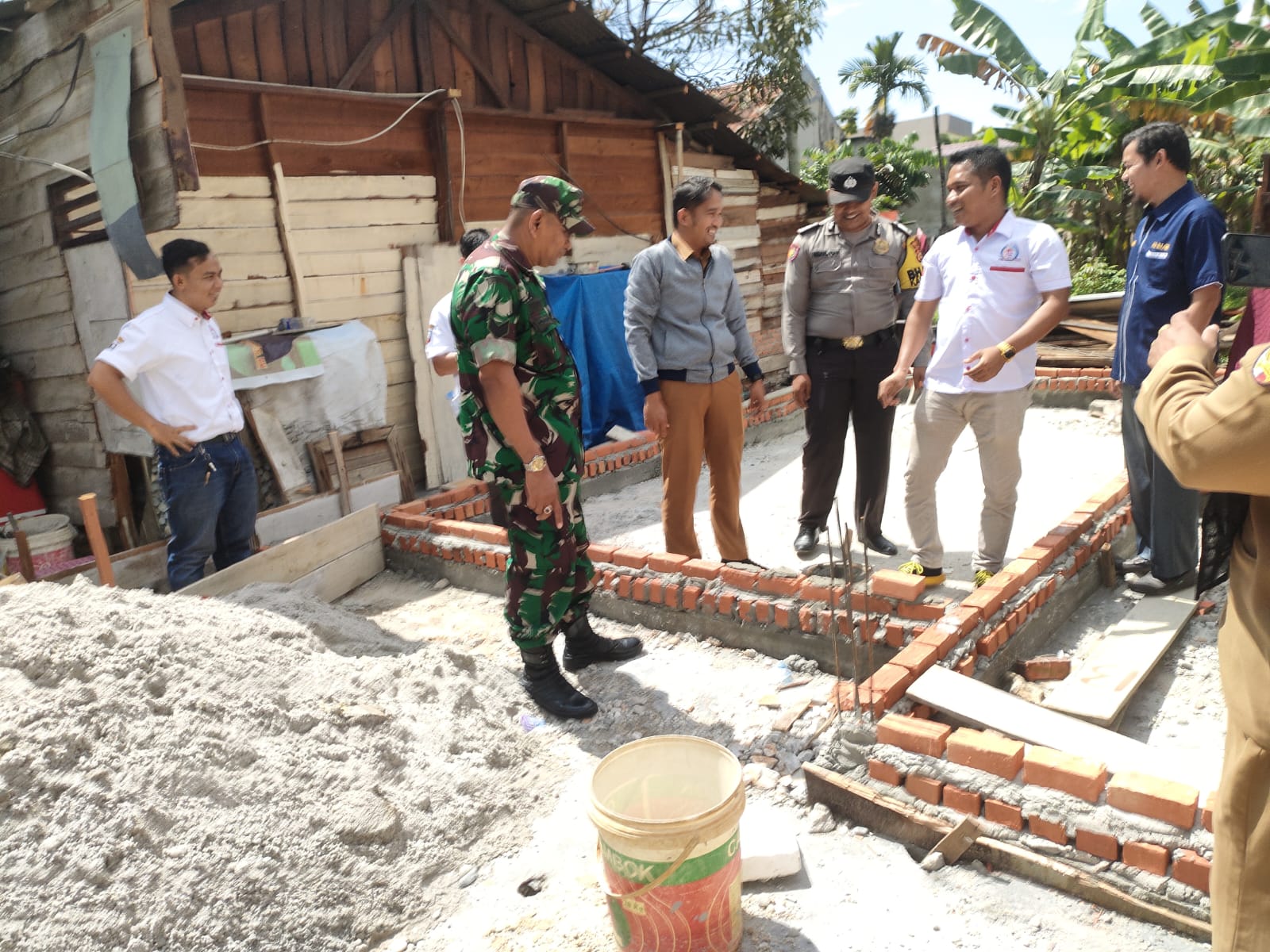 Babinsa Koramil 06/Sukajadi Kodim 0301/PBR, Serka Nasaruddin menghadiri peletakan batu pertama pembangunan rumah tidak layak huni (RTLH) kepada penerima manfaat, Misnawati (50) Jalan Suka Karya RT 07 RW 04 Kelurahan Tuah Karya Kecamatan Tuah Madani,.
