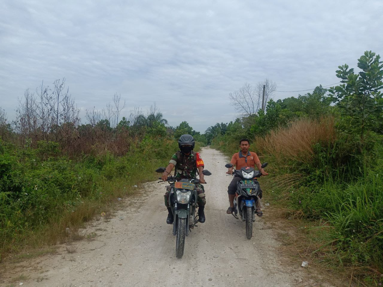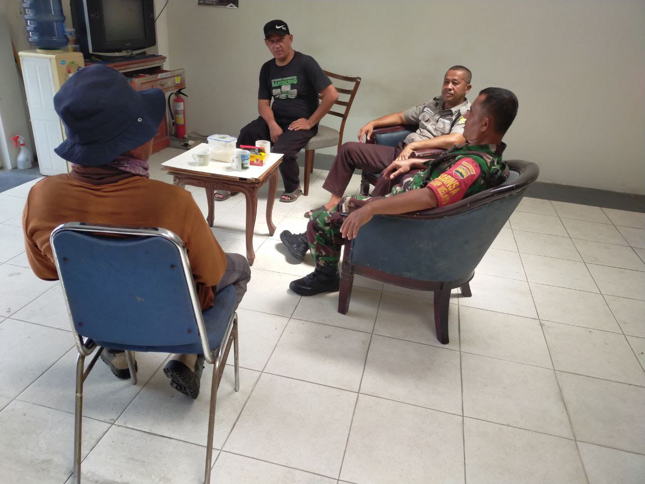 Babinsa Koramil 06/Sukajadi Kodim 0301/PBR, Serma Budi Mulia melaksanakan Komunikasi sosial (Komsos) Babhinkamtibmas Aipda Sigit Kurniawan, tokoh masyarakat Masril, Ucok Jalan Kesuma Kelurahan Jadirejo Kecamatan Sukajadi, Pekanbaru, Kamis.