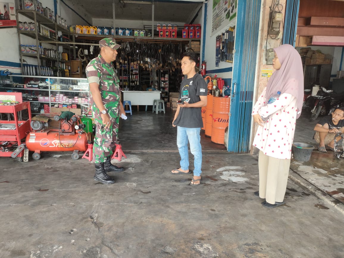 Babinsa Koramil 06/Sukajadi Kodim 0301/PBR, Serka Nasaruddin melaksanakan komunikasi sosial dengan pelaku usaha yang berada di Jalan H R Soebrantas Kelurahan Tuah Karya Kecamatan Tuah Madani, Pekanbaru, Kamis.