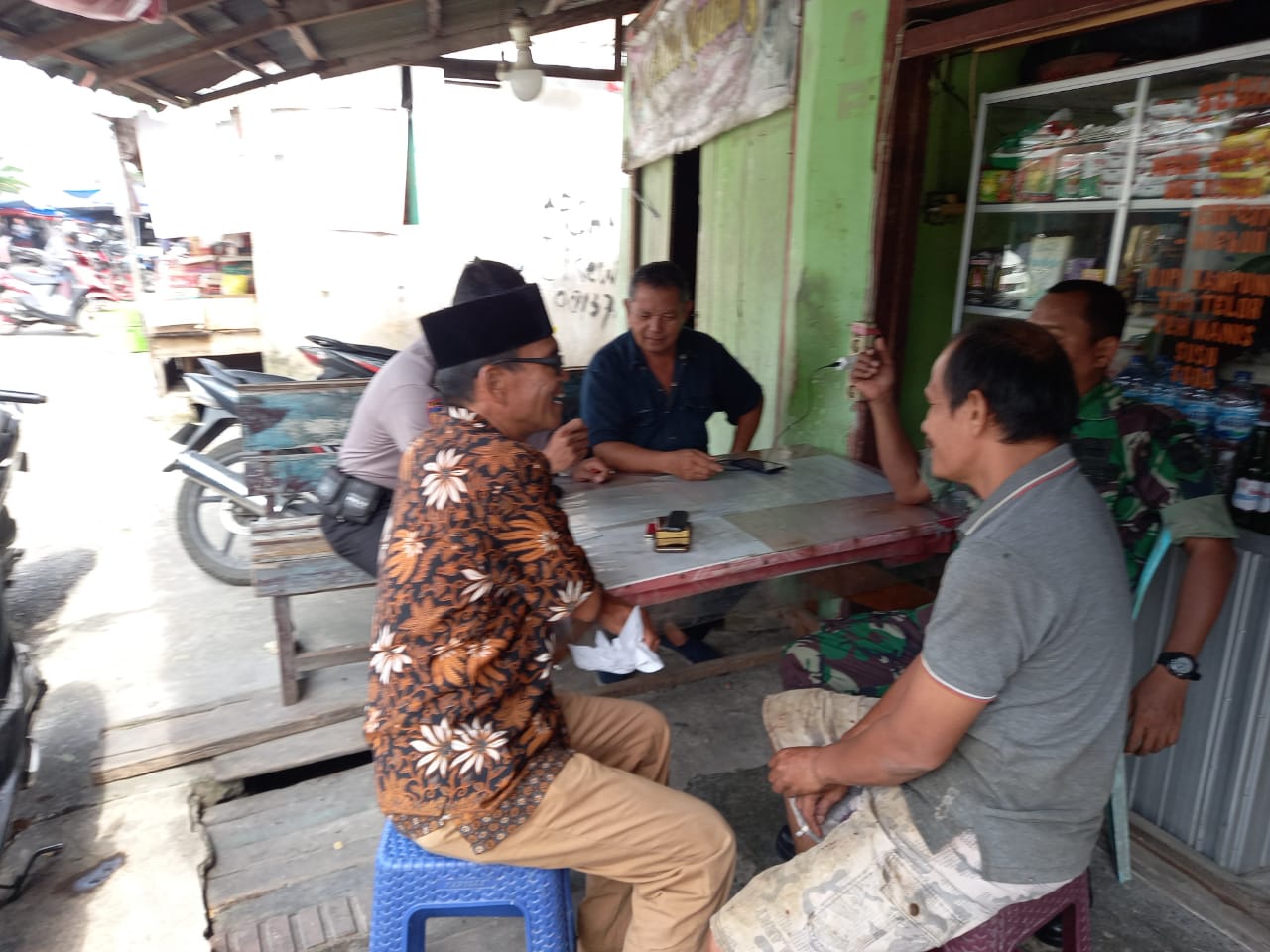 Babinsa Serka Kusman Darmanto, Koramil 06/SKJ Kodim 0301/PBR melaksanakan Komsos dengan tokoh masyarakat Sakijo di warung lontong ibu Lia Jalan Wijaya Kelurahan Kedungsari Kecamatan Sukajadi Kota Pekanbaru, Sabtu.