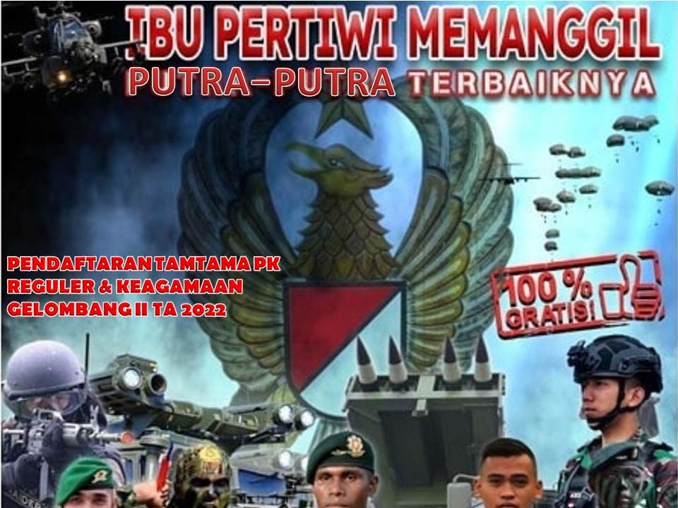 Tentara Nasional Indonesia Angkatan Darat (TNI AD) membuka pendaftaran Tamtama Prajurit Karier (PK) Reguler dan Keagamaan Gelombang.
