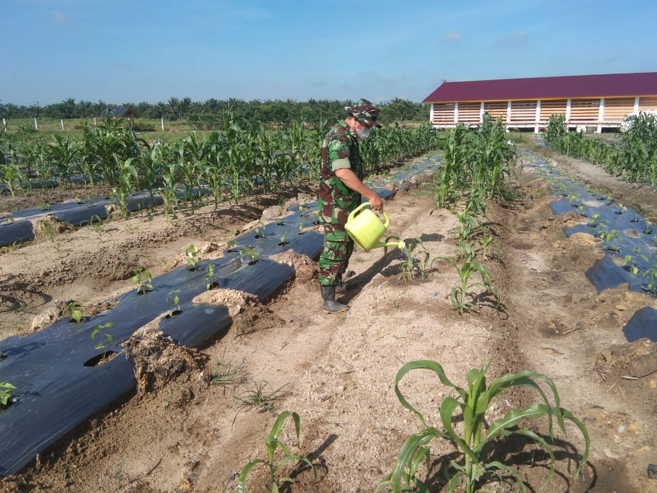 Babinsa Koramil 06/Sukajadi Kodim 0301/PBR, Serda Jhoni Janan melaksanakan kegiatan perawatan tanaman Jagung yang usia tanam 46 hari di lahan ketahanan pangan Kodam I/BB, Jalan Sri Sejahtera, Kelurahan Agrowisata, Kecamatan Rumbai Barat, Pekanbaru,.