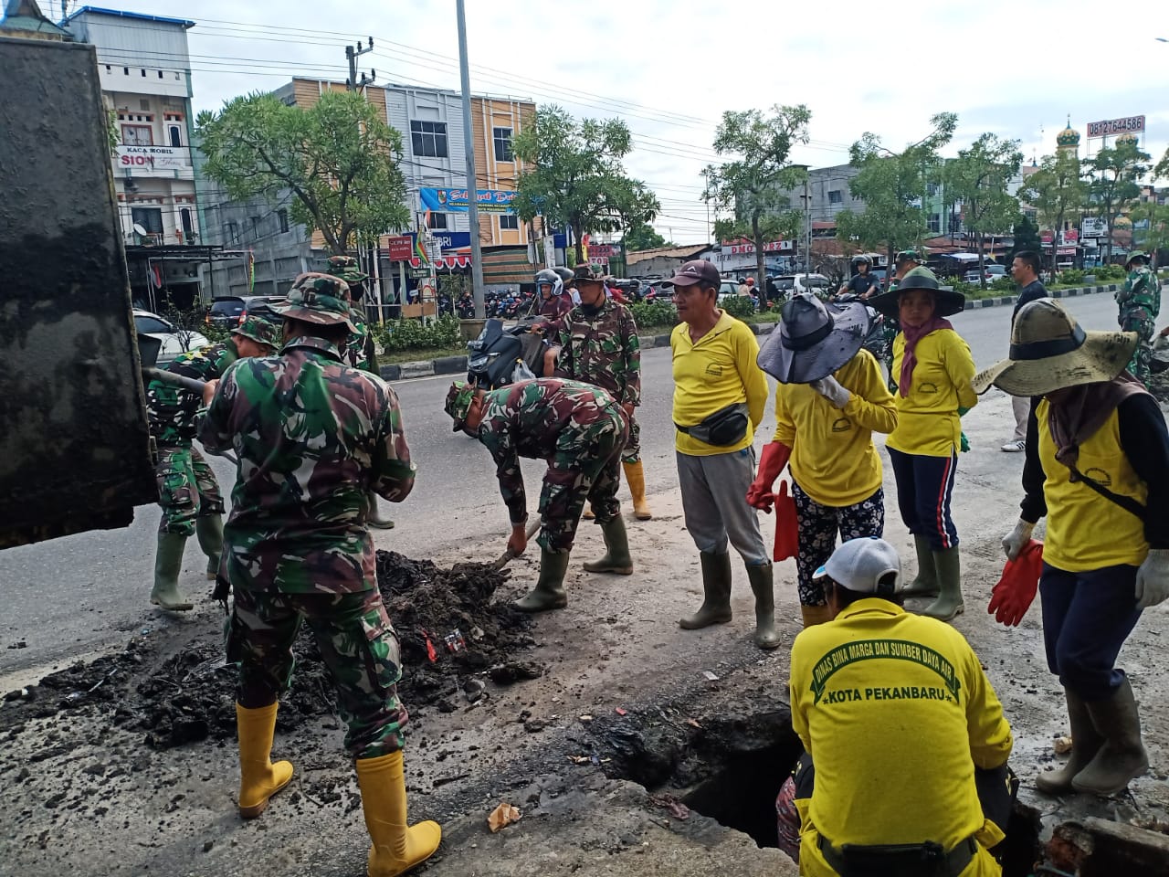 Guna mewujudkan Kota Pekanbaru bebas dari sampah dan banjir, Personel Kodim 0301/PBR bersama Pasukan Kuning Pemko setiap hari melaksanakan gotong royong normalisasi parit dan gorong-gorong di sepanjang jalan HR Soebrantas Kelurahan Sidomulyo Barat.