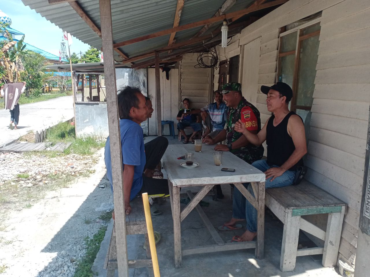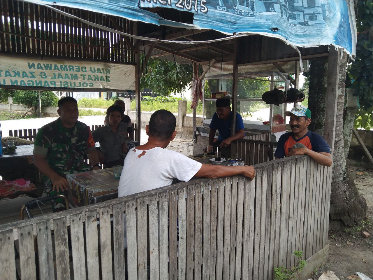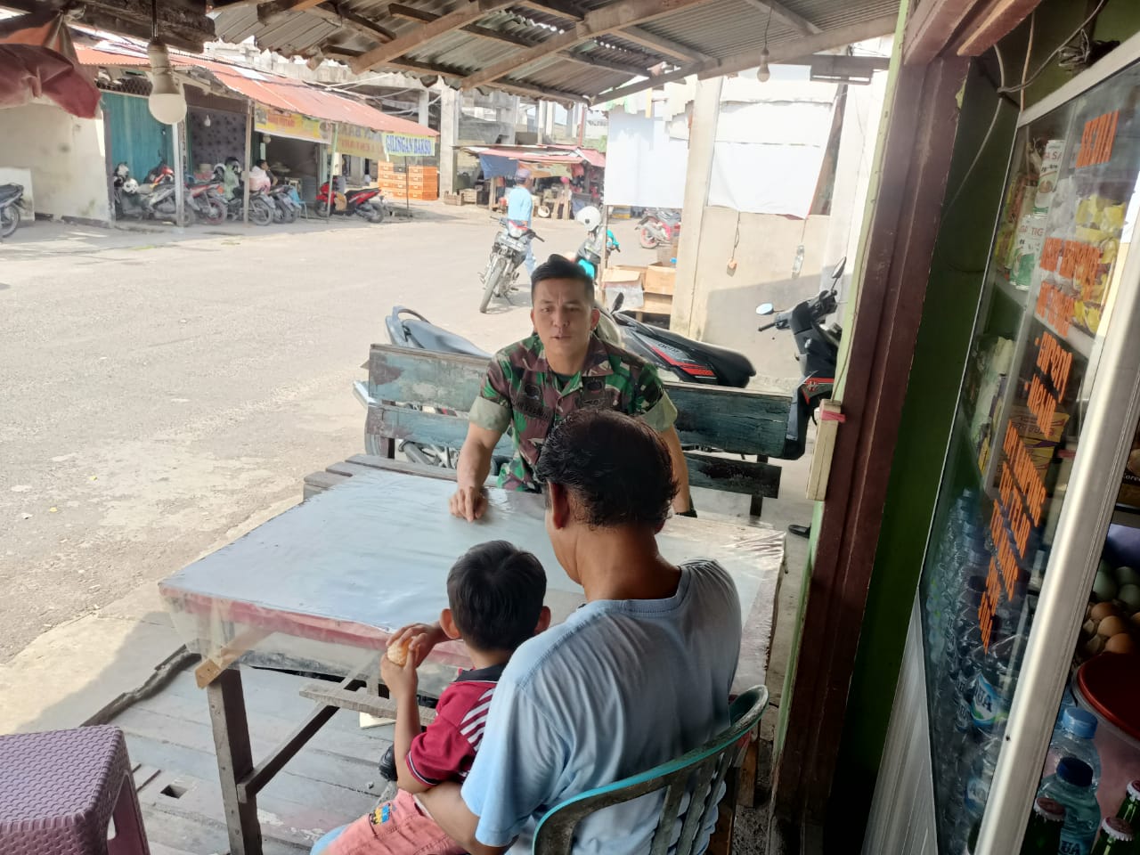 Babinsa Koramil 06/Sukajadi Kodim 0301/PBR, Serka Toni Efendi melaksanakan komunikasi sosial dengan tokoh masyarakat RT 04, Masril di warung Atuk Jalan Swadaya Kelurahan Delima Kecamatan Tuah Madani, Pekanbaru, Selasa.