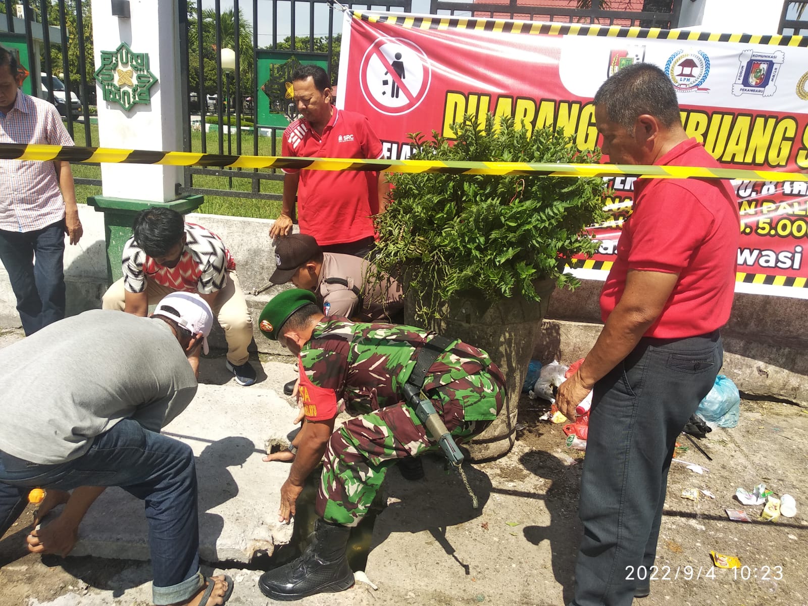 Bintara Pembina Desa (Babinsa) Koramil 06/Sukajadi Kodim 0301/PBR, Serka Adeng memasang spanduk Imbauan larangan sampah di pagar UIN Suska Jalan KH Ahmad Dahlan, Senin.