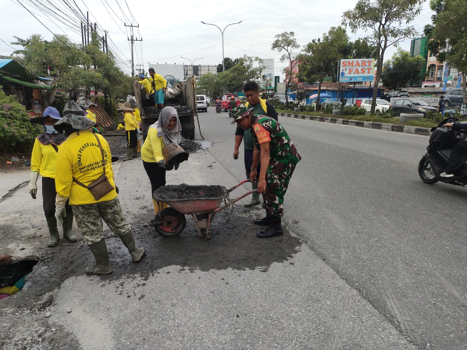 Dengan menggunakan alat sederhana, Sertu Wiyono tergabung Satgas Kodim 0301/PBR bersama petugas kuning PUPR Pekanbaru melaksanakan gotong-royong normalisasi drainase, parit dan gorong gorong di Jalan H R Soebrantas Kelurahan Sidomulyo Barat.